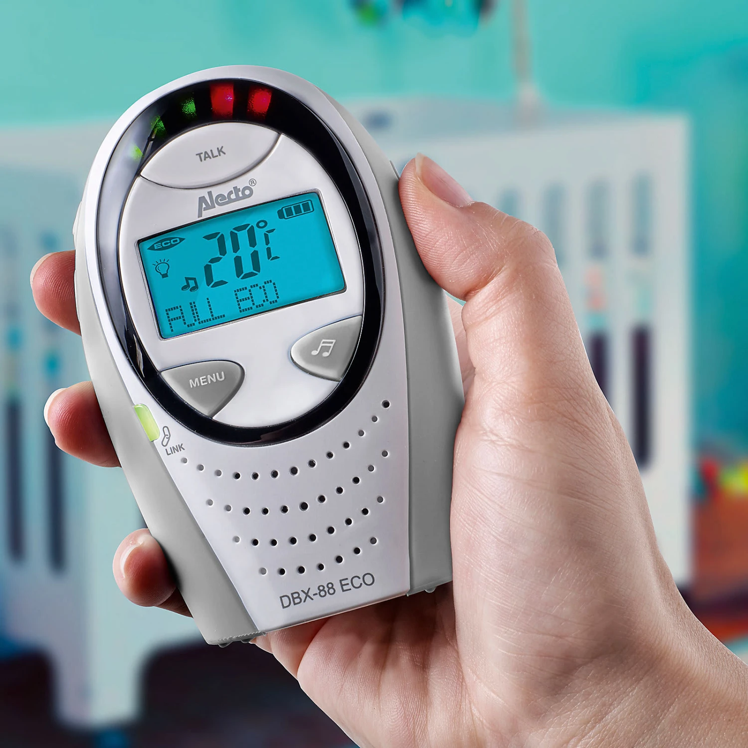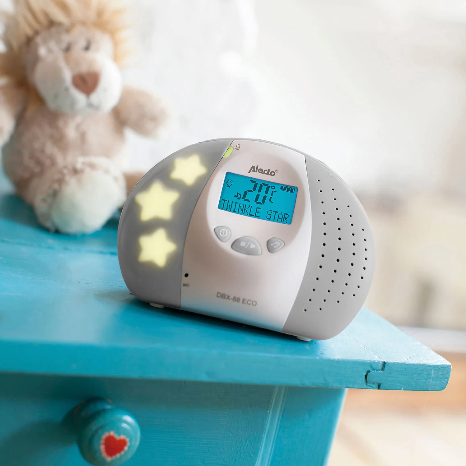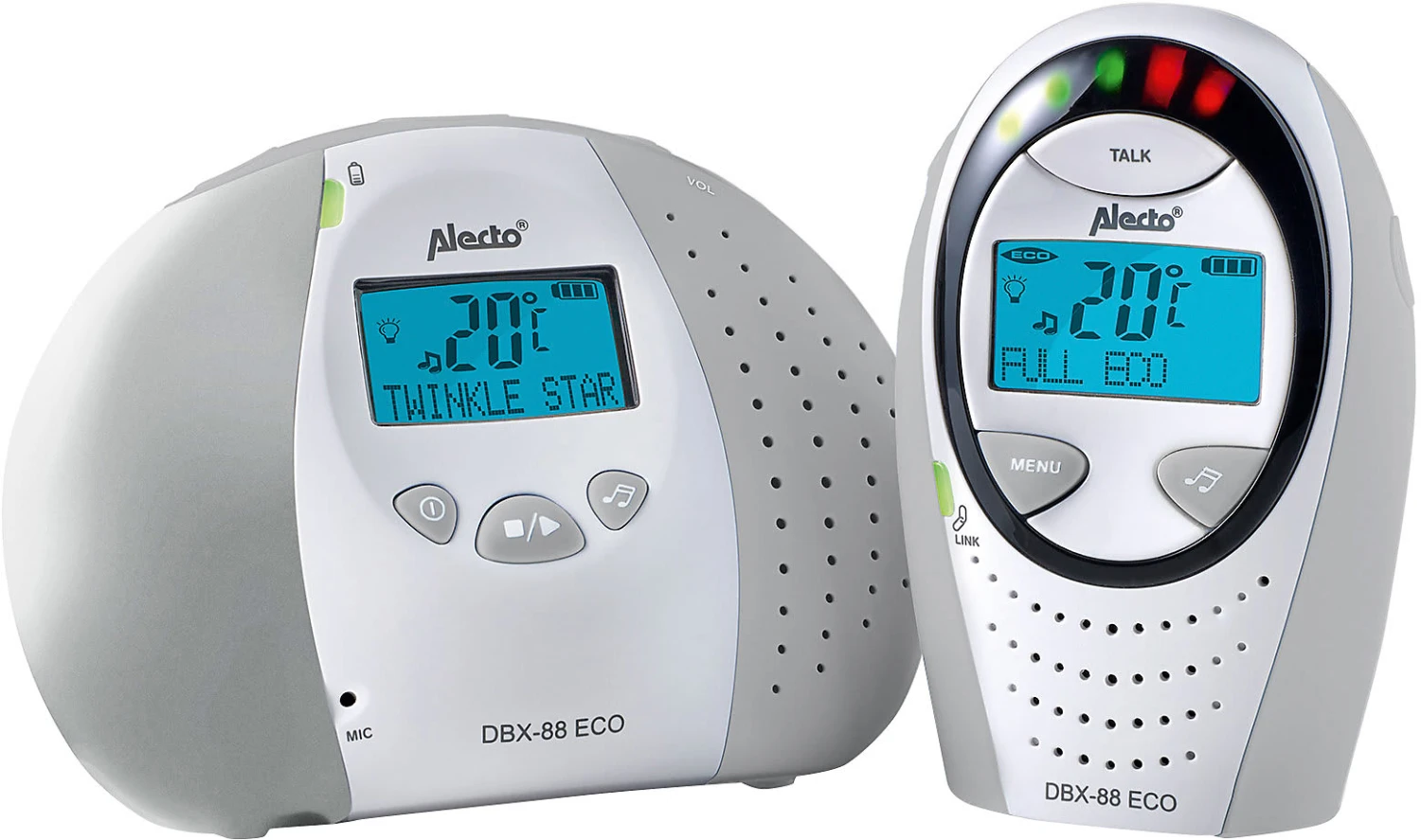 Das Alecto DECT Babyphone DBX-88 mit DECT-Technologie und Display funktioniert störungsfrei und mit einer umfassenden Reichweite von bis zu 300 m. Es verfügt über einen energiesparenden Full ECO-Modus und hat außerdem ein integriertes Nachtlicht. Dank der Gegensprechfunktion können Sie Ihr Baby auch dann beruhigen, wenn Sie sich nicht im selben Raum aufhalten. Fünf Schlaflieder oder Naturklänge helfen Ihrem Kleinen beim Einschlafen. Das Gerät schaltet sich bei einem Geräusch ihres Babys automatisch ein und zeigt Ihnen auf der Elterneiheit auch die Zimmertemperatur im Babyzimmer an.