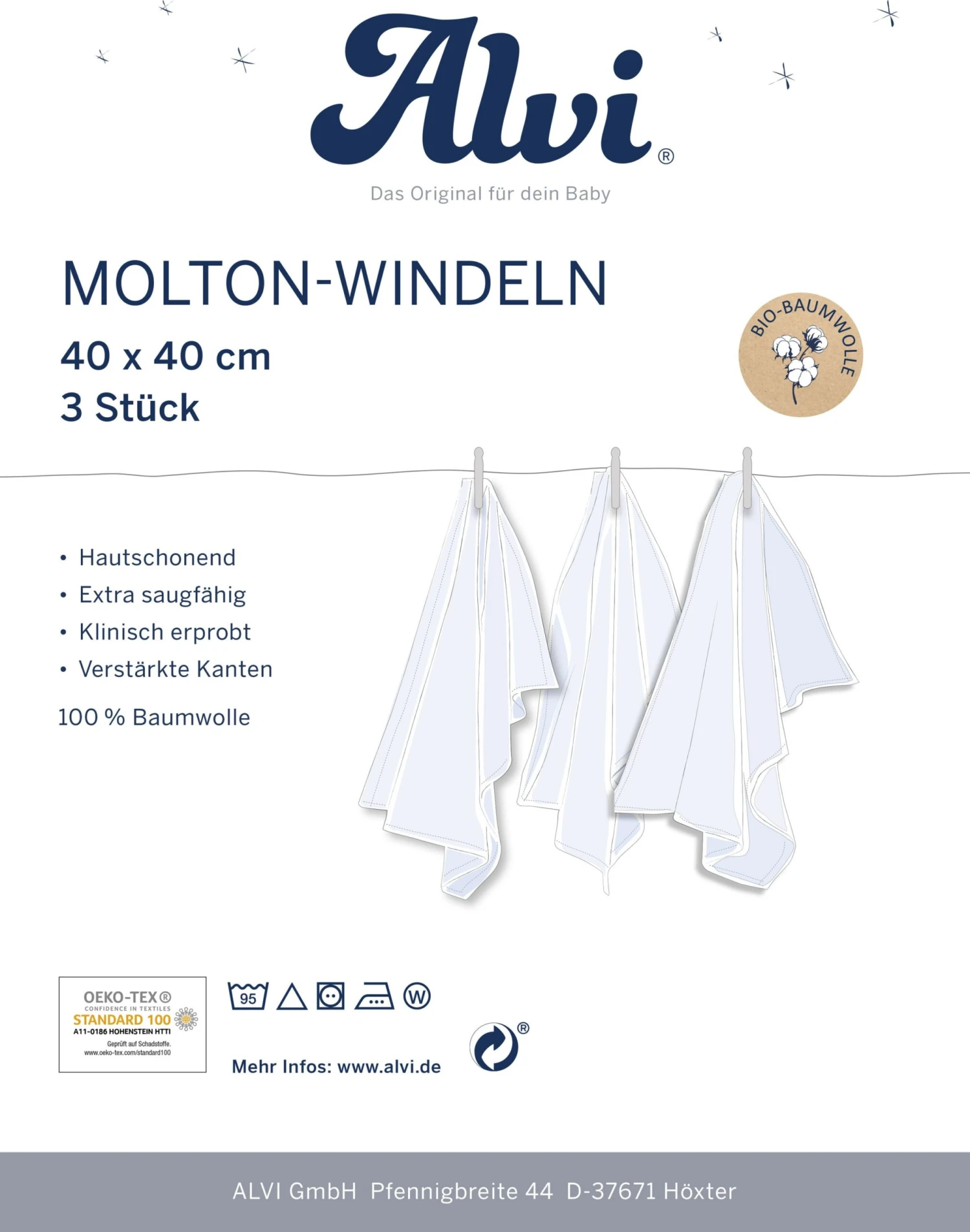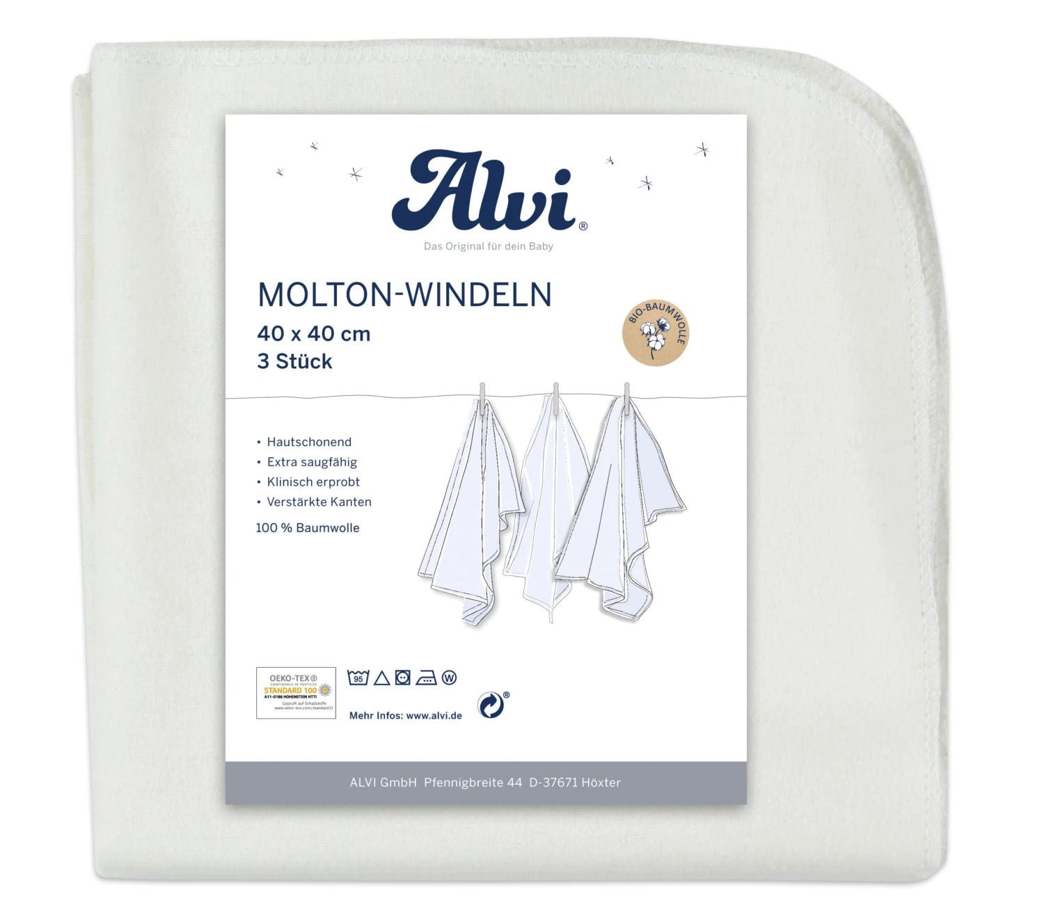 Das ALVI® Molton Windeln 3er Pack sind nicht nur saugfähig und vielseitig verwendbar, sondern auch aus nachhaltiger 100% ‘iger Baumwolle (Bio). Die kochfesten, weißen Moltontücher von Alvi® gehören zu jeder Babyausstattung. Ein praktischer Helfer im Alltag mit Babys: als Spucktuch, Sichtschutz oder Wickelunterlage.