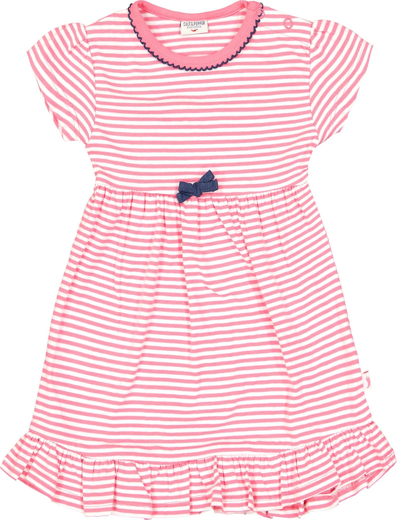 Das kurzärmelige Kleid von Salt & Pepper begeistert mit Bio-Baumwolle und verspieltem Design. Kleid kurzarm von Salt & Pepper geringelt, ausgestellter Schnitt, Naht mit applizierter Zierschleife und dekorativer Faltenlegung unter der Brust, Rüschen-Saum am Rock Rundhalsausschnitt mit Wellenkante Druckknöpfe an der Schulter mit Bio-Baumwolle Das Kleid ist zu einem hohen Anteil aus Bio-Baumwolle hergestellt und verspricht so ein angenehm weiches Gefühl auf der Haut. Eine leichte Beigabe von Elasthan sorgt für ausreichend Bewegungsfreiheit. Damit das An- und Ausziehen leicht gelingt, sind an der Schulter Druckknöpfe angebracht. Sind diese geöffnet, gewinnt der Rundhalsausschnitt an Weite und der Kopf passt ganz leicht hindurch. Optisch begeistert das Kleid mit klassischem Ringel-Look und ausgestelltem Schnitt. Eine Naht mit applizierter Zierschleife und dekorativer Faltenlegung unter der Brust setzt Oberteil und Rock voneinander ab. Der Rüschen-Saum am Rock schafft einen verspielten Akzent.