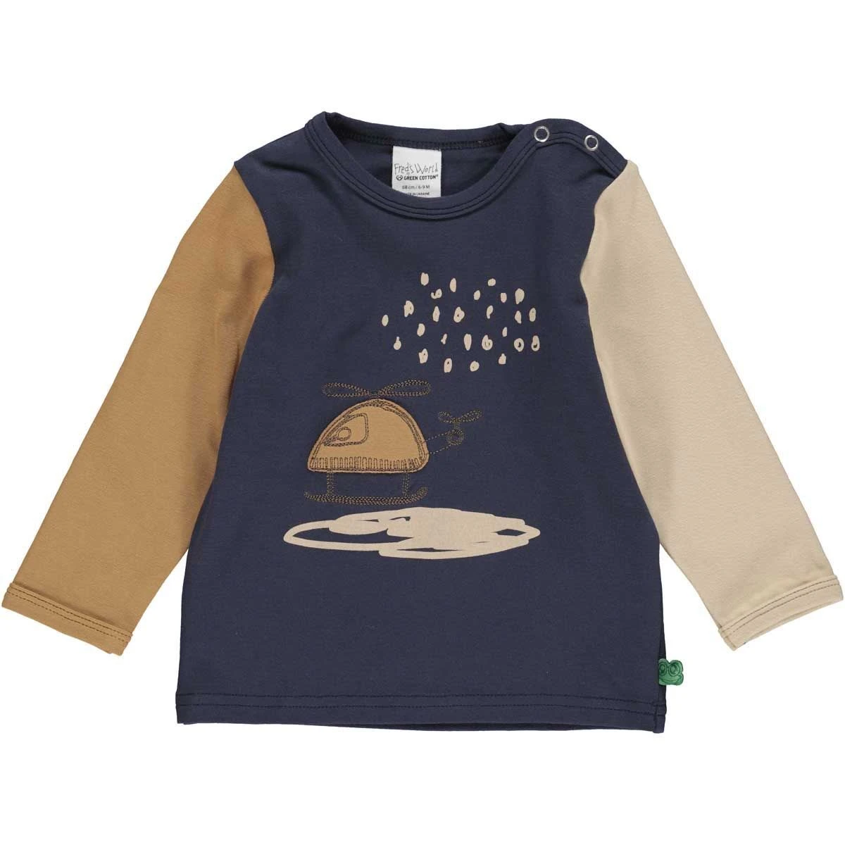 Das Langarmshirt ist aus weicher Bio-Baumwolle hergestellt. Es verfügt über einen coolen Helicopter Druck auf der Vorderseite. Die Ärmel des Shirts sind in zwei unterschiedlichen Farben abgesetzt. Druckknöpfe im Nackenbereich erleichtern das An- und Ausziehen. Das Produkt ist durch Ecocert Greenlife Lic. No. 152033 GOTS Organic zertifiziert. Dies ist aktuell der höchste Standard für Bekleidung. Alle Produktionsprozesse wie Färben, Weben und Nähen werden unter strengsten Vorgaben mit Rücksicht auf die Umwelt durchgeführt. Auch die Arbeitsbedingungen werden während der einzelnen Produktionsschritte streng überwacht. Baumwolle 97%, Elasthan 3%