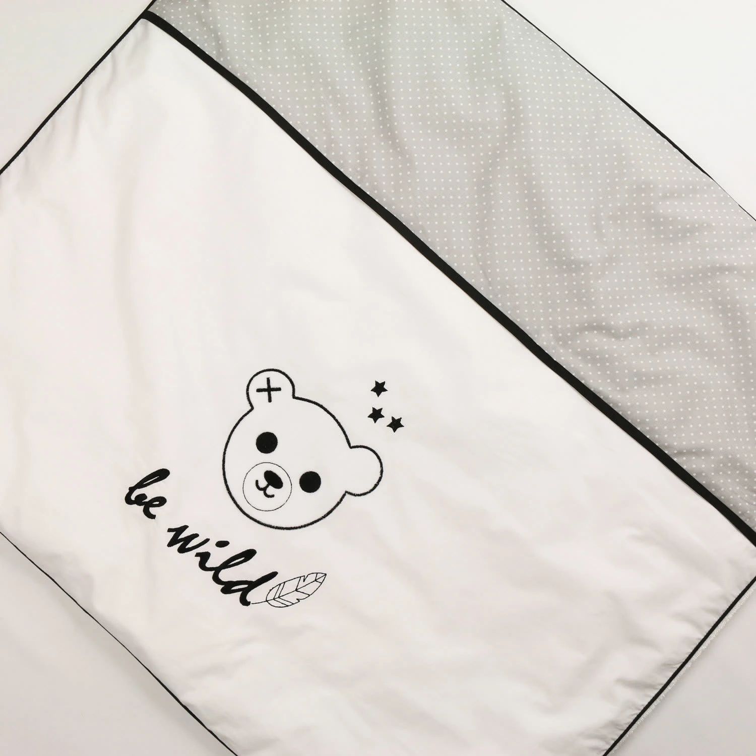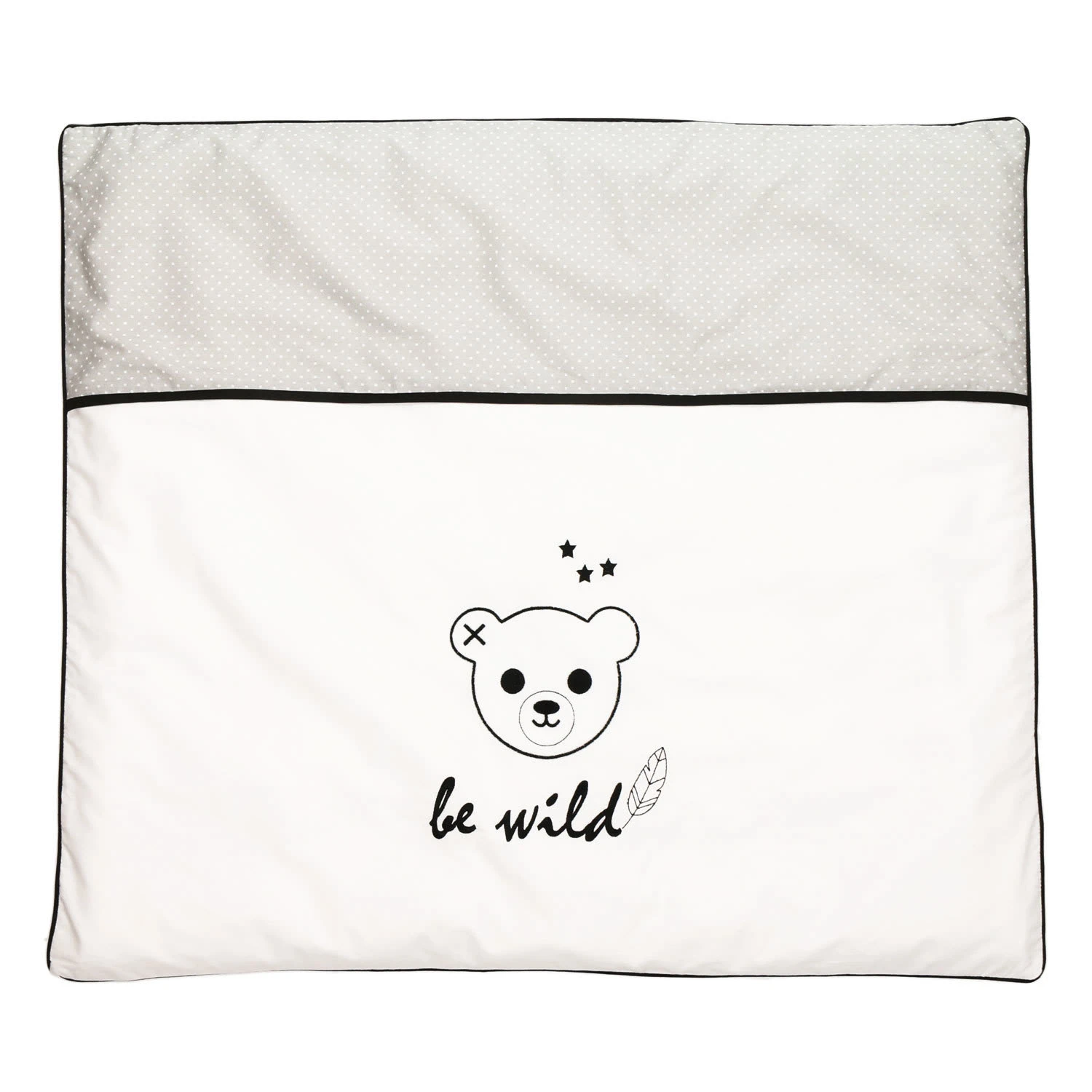 vorne: mit aufwendig bearbeiteten Applikationen: Teddybär mit dem Schriftzug „be wild“ (der Bär ist aus weißem Nicky) Feder und Sterne