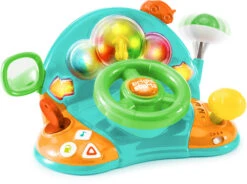 Mit echten Autogeräuschen, Gangschaltung und einem beweglichen Lenkrad macht Ihr Kleines bald die Fahrt seines Lebens. Dieses Musikspielzeug zum Sitzen von Bright Starts bringt die Straße direkt in Ihr Wohnzimmer. Schalten Sie das Autoradio lauter, stellen Sie den Spiegel ein und stellen Sie alles auf eine Reise durch die Fantasiewelt Ihres Babys ein.