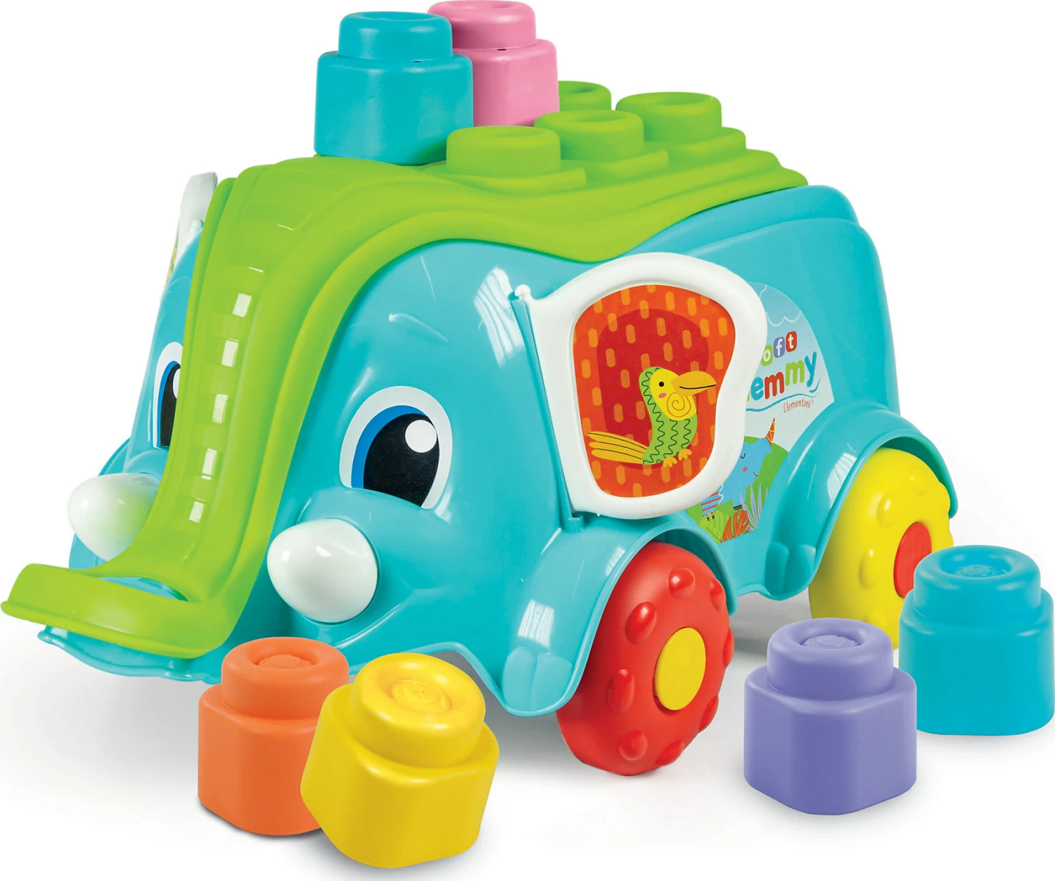Clemmy von Clementoni ist ein toller kleiner Wagen in Form eines Baby-Elefanten, der sich überallhin mitnehmen lässt und für viele Abenteuer mit den Bausteinen sorgt! Der Deckel dient als Steckplatte für die weichen Clemmy-Bausteine, enthält aber auch einen praktischen Griff, um den Elefanten hinter sich herzuziehen. Im Inneren finden alle Bausteine Platz, um sie am Ende der Spielzeit darin zu verstauen.