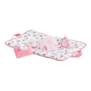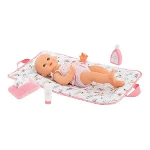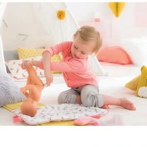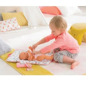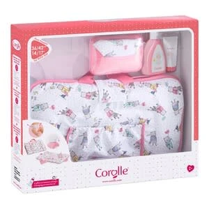 Mit dem Puppen-Wickelset von Corolle haben Puppeneltern alles zur Hand, was zum Wickeln der Babypuppe benötigt wird. Puppen Wickelset ab 2 Jahren geeignet für Corolle Babypuppen von 36-42 cm Größe Set enthält Windel, Feuchttücherbox, Cremetube, Babyöl-Flacon plus Tasche (als Wickelunterlage verwendbar) Set aus Kunststoff, Tasche aus Textil Enthalten sind eine Windel und eine Feuchttücherbox, ein Flacon mit Babyöl und eine Cremetube. Außerdem gehört zum Set eine Tasche aus bedrucktem Textil, die sich als Wickelunterlage nutzen lässt. Die kindgerechten Motive und sanften Pastelltöne sind perfekt abgestimmt auf die Designs der anderen Puppensets der Marke.