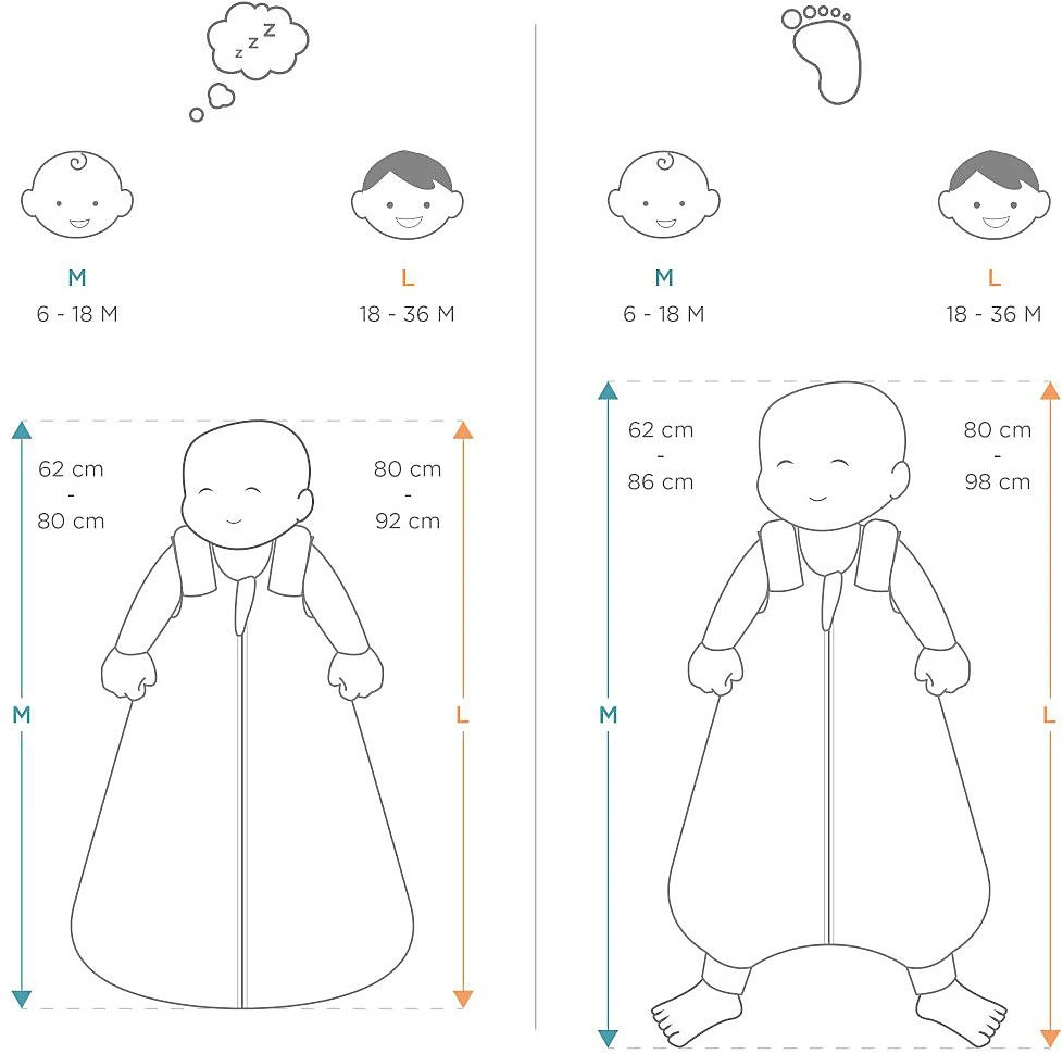Maße: Größe L (12-24 Monate): Im Schlafmodus für Babys von 80 bis 92 cm und als Strampler bis 98 cm (36 Monate)