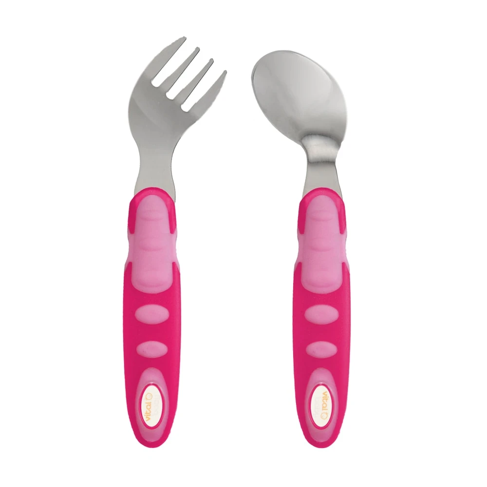 Ermutigen Sie Ihr Kind mit Hilfe des gebogenen Gabel- und Löffelsets selbst zu essen. Die weichen Einkerbungen an den Griffen erleichtern das Finden der richtigen Halteposition. Spezielle Größe für das wachsende Baby.