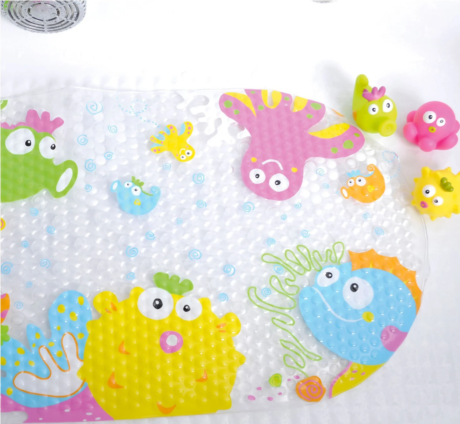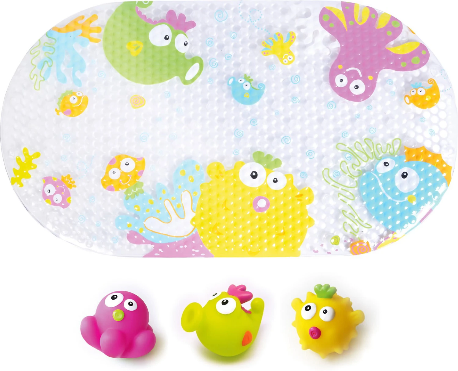 Die Badematte und die drei süßen Wasserspritztiere sind ein MUSS für alle Badefans. Die bunten Farben und lustigen Designs kommen nicht nur bei kleinen Bademeistern an – mit den Badetieren wird jeder seine Freude haben.
