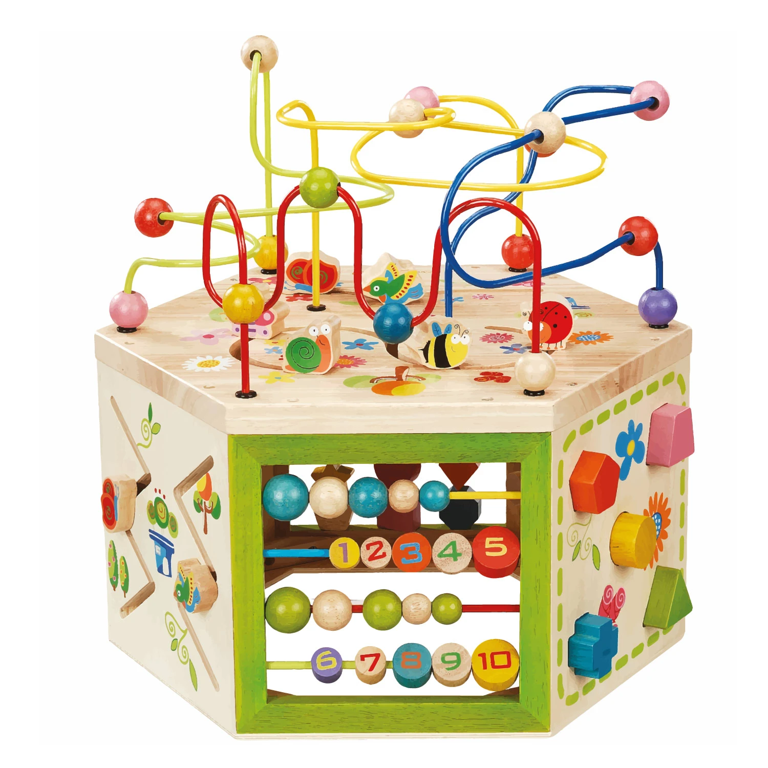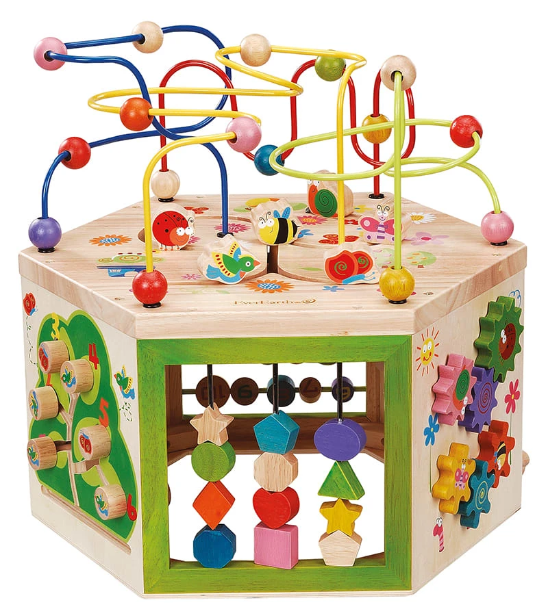 Das Holz-Spielcenter trainiert die Motorik und die Hand-Augen-Koordination der Kinder. Durch die vielen bunten Farben können sie ihre Farbwahrnehmung stärken. Zudem lernen sie Farben und Formen zu erkennen und zu sortieren.