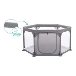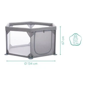 Das sechseckige Laufgitter von Fillikid bietet aktiven Minis Bewegungsfreiheit und Sicherheit. Die Seitenwände aus Netzstoff bieten einen guten Einblick, gleichzeitig kann der Nachwuchs seine Umgebung besser wahrnehmen. Lieferumfang: Laufgitter mit Transporttasche von Fillikid, 6-eckig, gepolsterter Boden, seitliche Öffnung mit Reißverschluss, Tragetasche Material: Kunststoff, Metall, Seitenwände aus Netzstoff (Polyester) Verwendung: Laufgitter Belastbarkeit: bis 15 kg Maße: 117(L) x 117(B) x 67(H) cm, Durchmesser 134 cm, mit Tragetasche 21(L) x 16(B) x 65(H) cm Das Laufgitter ist mit wenigen Handgriffen aufgebautet und bietet dem Nachwuchs mit seinen 134 Zentimetern Durchmesser ausreichend Platz zum Bewegen und Entdecken. Durch die seitlichen Wände aus Netzstoff ist das Kind geschützt und immer im Blick. Gleichzeitig ist auf diese Weise für eine angenehme Luftzirkulation gesorgt. Wenn das Laufgitter nicht mehr benötigt wird, kann es platzsparend in der praktischen Tragetasche verstaut werden. Eine Seitenwand ist mit einem Reißverschluss ausgestattet. Wird dieser geöffnet, kann der Stoff nach oben aufgerollt und befestigt werden. Das Kind kann dann unter Aufsicht eigenständig in das Gitter hinein- oder aus ihm herauskrabbeln. Der weich gepolsterte Boden bietet einen hohen Komfort. Er ist bis zu einem Gewicht von 15 Kilogramm belastbar.