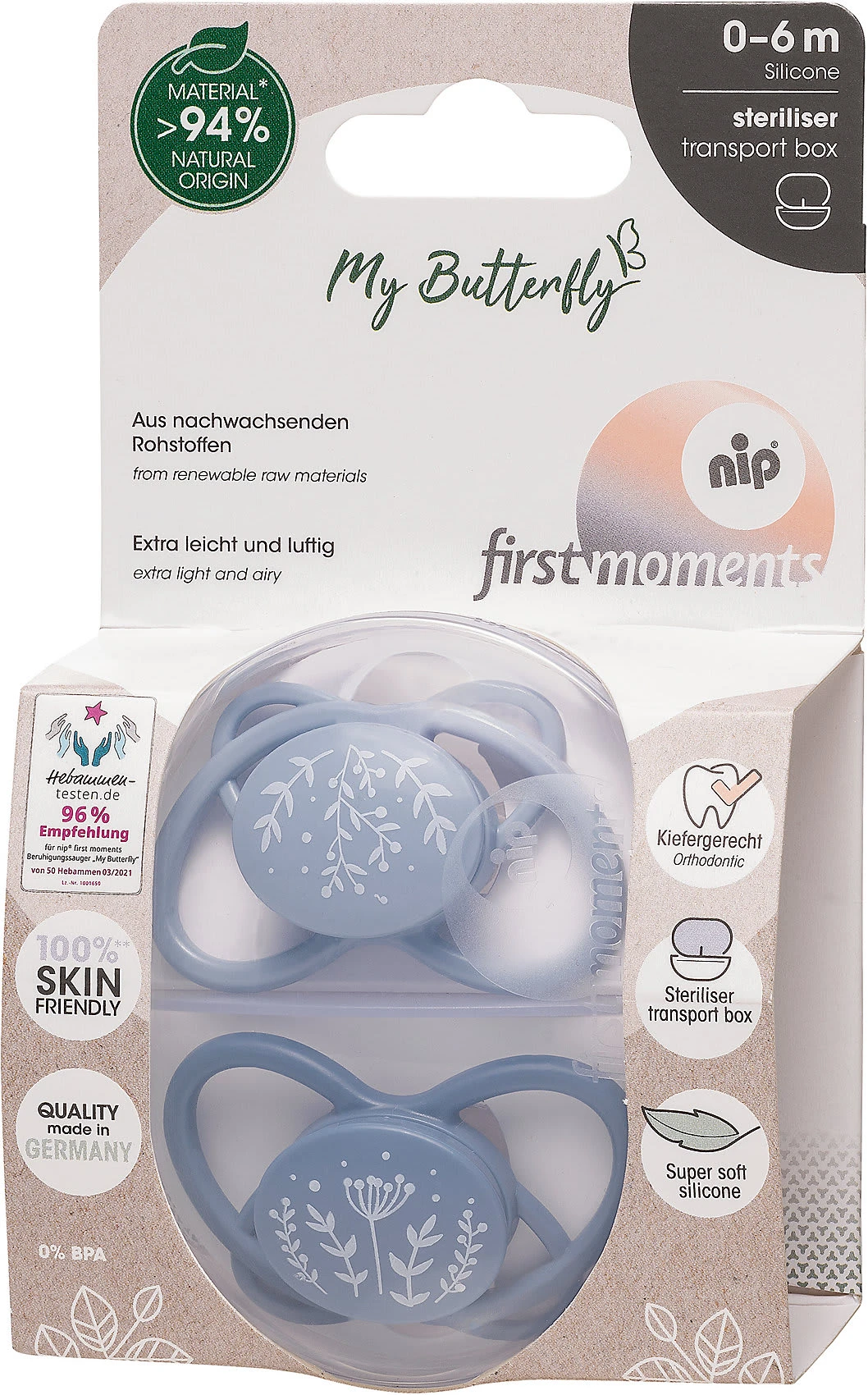 Durch die symmetrische Form des Saugteils kann der nip® first moments BS „My Butterfly“ Schnuller nie falsch herum benutzt werden und ist damit besonders kiefergerecht und stillfreundlich. Durch die schlanke, durchlässige Form der Schnullerscheibe kommt besonders viel Luft an die empfindliche Babyhaut, was Ausschlägen und Hautreizungen vorbeugen kann und für ein besonders angenehmes Tragegefühl sorgt.
