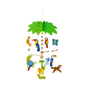 Das bunte Mobile von GOKI mit verschiedenen Dschungel-Tieren verzaubert jedes Kind und sorgt für die optimale Ablenkung beim Wickeln oder im Babybett. 22-teiliges Mobile aus Holz 22 x 42 cm lackiertes Holz ab Geburt geeignet Viele verschiedene Tiere in bunten Farben lenken die Aufmerksamkeit auf sich. So sorgen sie für Ablenkung und helfen dem Kind auch in den Schlaf. Ist das Kind größer, lernt es die Namen der Tiere und kann spielerisch auch Farben lernen. Hinweis ACHTUNG! DEKORATIONSARTIKEL/MOBILE. Außer Reichweite von Kindern aufhängen! Verletzungsgefahr durch Verheddern.
