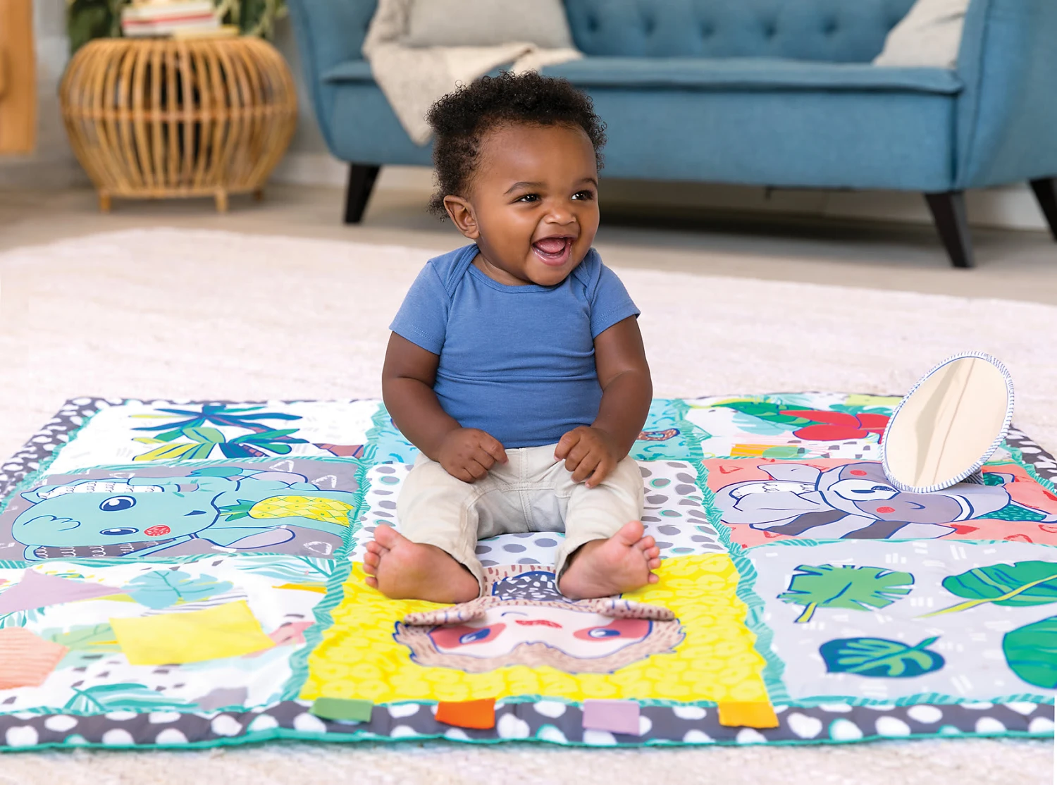 – strukturierte Formen, knisternde Geräusche, bunte Bänder und ein Selfie-Spiegel für ein interaktives, sensorisches Spielvergnügen