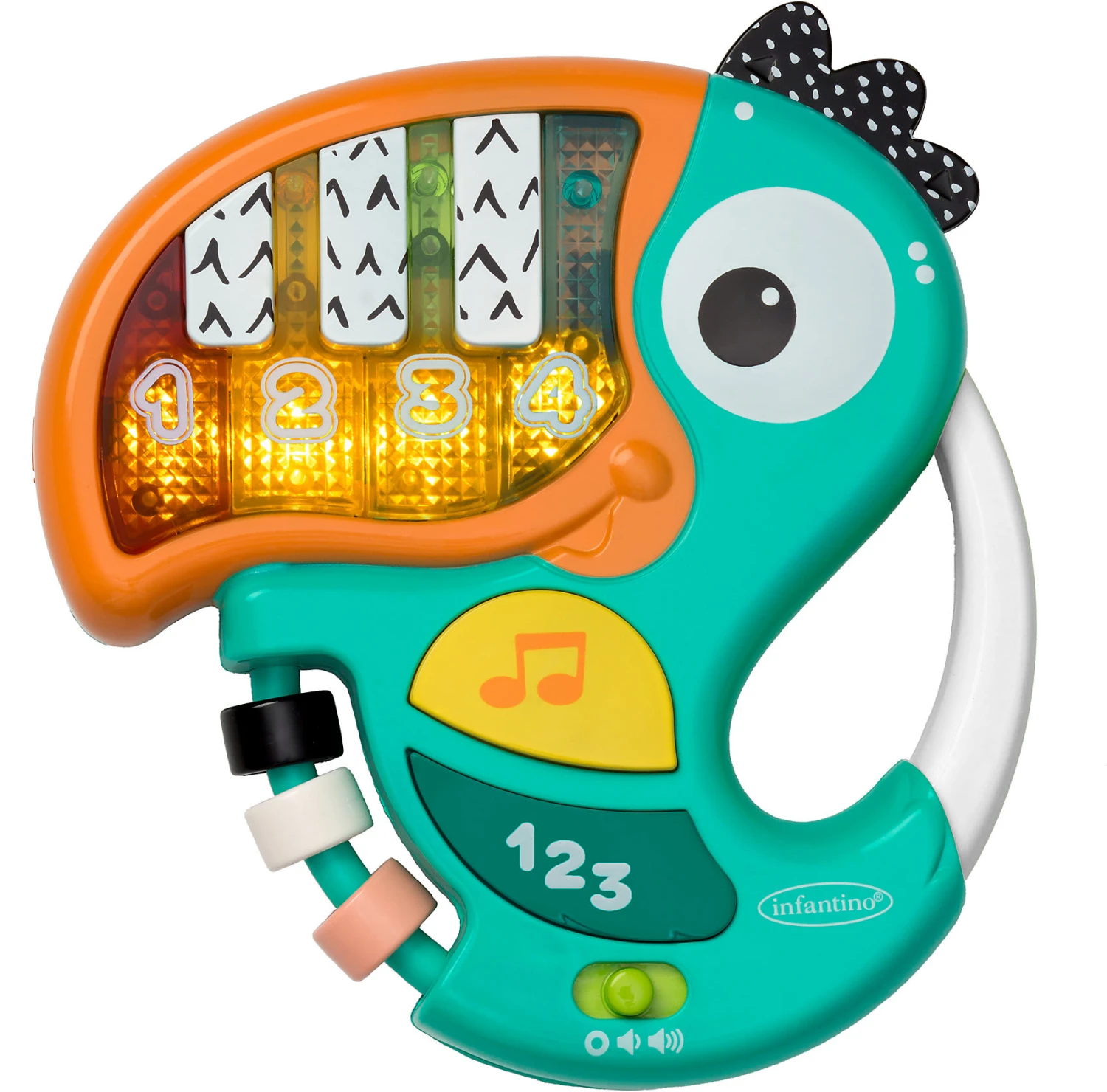 Das Tukan-Klavier von infantino ist ein vielseitiges Spielzeug für Babys. Es macht mit Liedern, Wörtern und Geräuschen neugierig. Musikspielzeug Tukan-Klavier von infantino 6 Lieder, 18 gesprochene Wörter und 13 Geräusche ab 6 Monaten aus Kunststoff Mit dem Tukan-Klavier von infantino kann das Kind Lieder hören und mitsummen, Zahlen lernen und gesprochene Wörter erklingen lassen. Das Klavier blinkt und leuchtet, wenn die Notentaste oder die Zahlen aktiviert werden. Sechs Lieder, 18 gesprochene Wörter und 13 lustige Geräusche bieten Unterhaltung und Lernspaß. Das Spielzeug ist leicht zu handhaben und auch für kleine Kinderhände gut zu greifen. Hinweis Batterien 2x AAA sind im Lieferumfang enthalten.