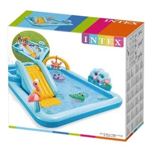 Spielend Abenteuer erleben mit dem Dschungel-Paradies von Intex, bestehend aus zwei Pools, einer Wasserrutsche und tierischen Freunden. Playcenter Jungle Adventure von Intex aufblasbar 2 Pools mit Wasserrutsche, Affe, Krokodil, Seepferd und Ringwurfspiel Flamingo inkl. Ablassschraube, Regelventil und Reparaturflicken Maße: ca. 244(L) x 198(B) x 71(H) cm Materialstärke: 0,30 mm geeignet ab 2 Jahren Maximalbelastung: 81 kg Im Dschungel Paradies von Intex wird es nie langweilig! Über eine Wasserrutsche gelangt der Nachwuchs vom kleinen in den großen Pool. Die extraweiche Landematte garantiert dabei sanftes Aufkommen. Im großen Planschbecken warten die abenteuerlustigen Tierfreunde Krokodil, Seepferd, Affe und Flamingo. Für weiteren Spielspaß sorgt das Ringspiel, bestehend aus einer Spielwand, fünf Bällen und Wurfring. Alle Elemente sind aufblasbar. Ablassschraube und Regelventil sorgen für ein angenehmes Handling. Für eine lange Nutzungsdauer sind im Set Reparaturflicken enthalten.