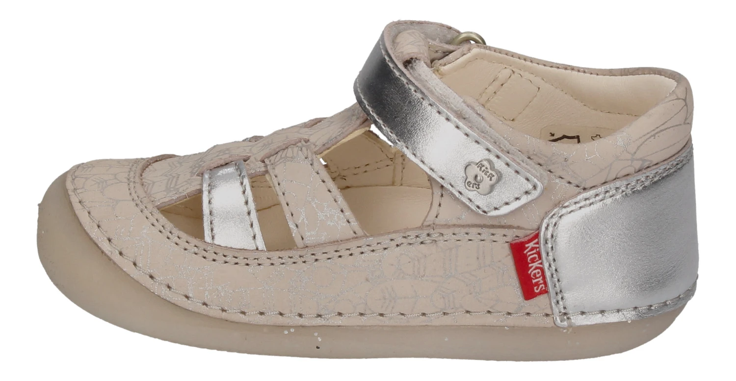 Kickers ist seit sehr langer Zeit bekannt für gute Kinder- und Babyschuhe. Diese niedlichen glitzernden Sandalen Sushy im silberfarbenen Metallic-Look sind innen wie auch außen aus weichem Leder gefertigt. Durch den Klettverschluß ist das An- und Ausziehen überhaupt kein Problem