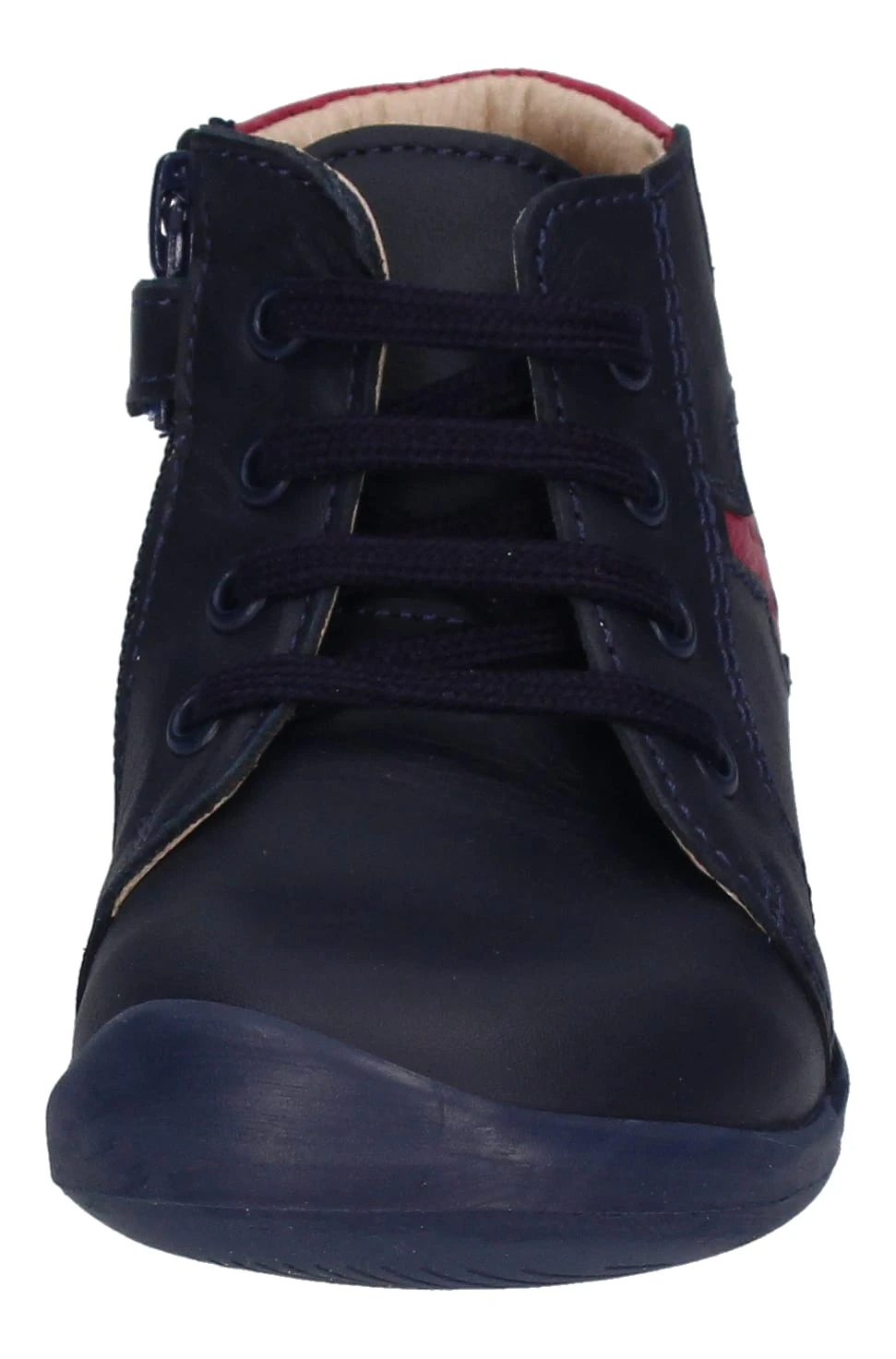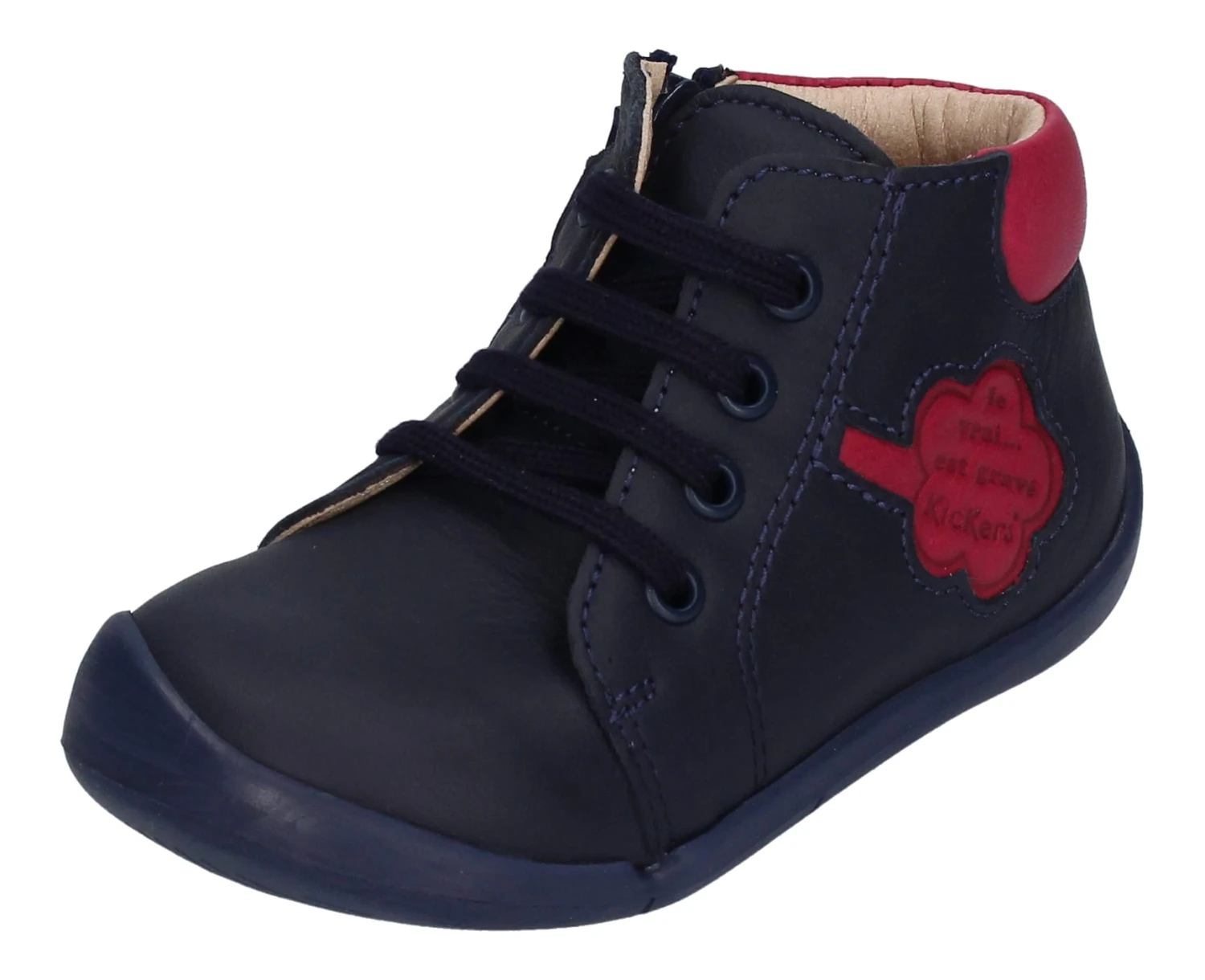 Kickers ist seit sehr langer Zeit bekannt für gute Kinder- und Lauflernschuhe. Diese niedlichen Lauflernschuhe WAOUK in dunkelblau sind mit der Kickersblume in pink verziert. Sie sind aus weichem Leder gefertigt und durch den Reißverschluß an der Innenseite ist das An- und Ausziehen überhaupt kein Problem