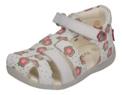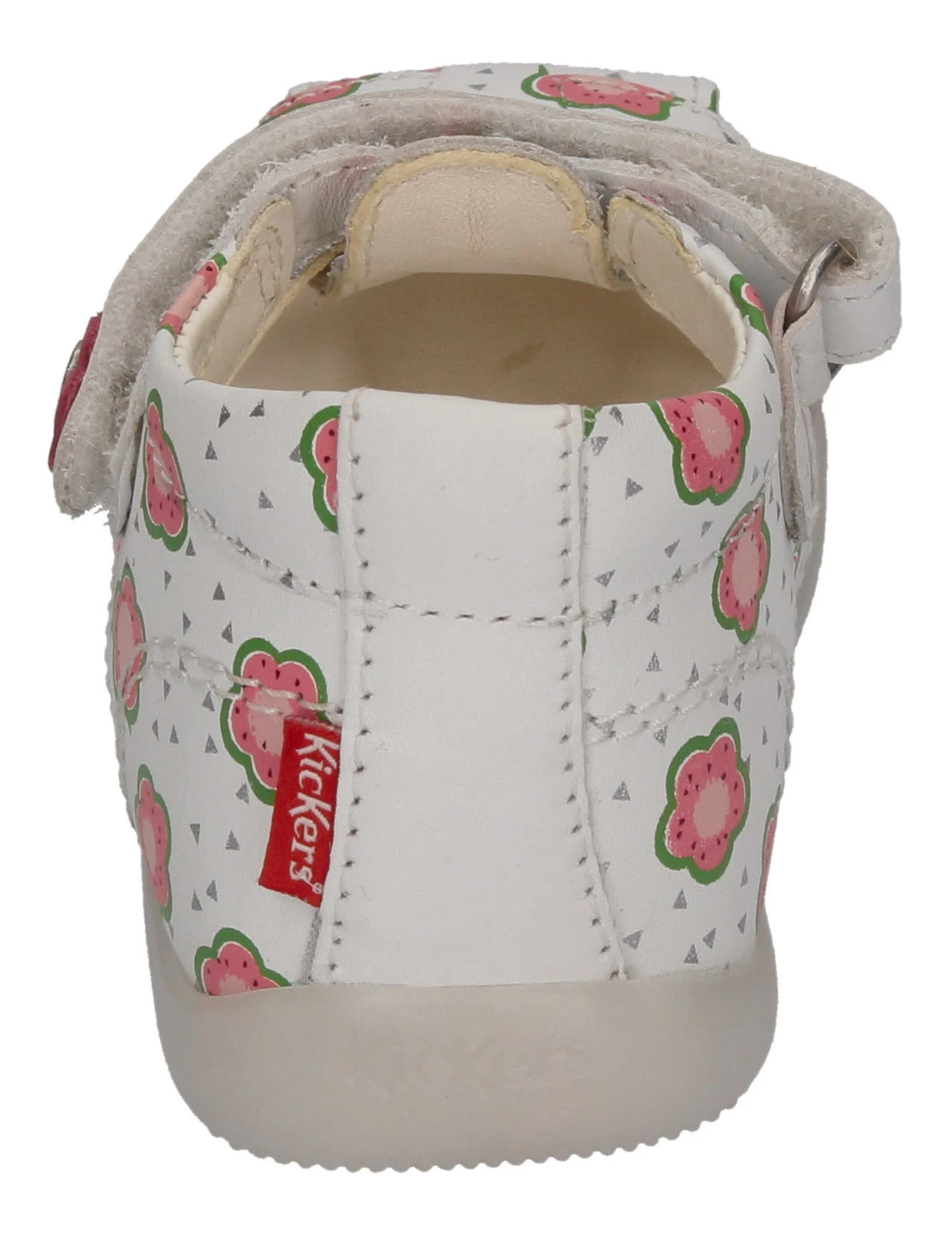 Kickers ist seit sehr langer Zeit bekannt für gute Kinder- und Babyschuhe. Diese niedlichen Sandalen Bigflo-2 in weiß mit süßem Blumenmotiv sind innen wie auch außen aus weichem Leder gefertigt. Durch den Klettverschluß ist das An- und Ausziehen überhaupt kein Problem. Zum Schutz der kleinen Zehen ist die Sandale vorn mit einem Riemchen versehen.