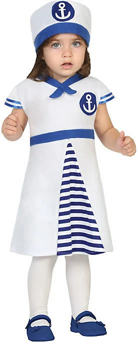 Ahoi! Mit dem Matrosinnen-Kostüm kommen kleine Seefahrerinnen voll auf ihre Kosten. Die blau-weiße Farbgebung ist im klassischen Streifenmuster gehalten, die durch einen blauen Kragen untermauert wird. Große Anker-Symbole lassen keine Zweifel mehr an der Seetauglichkeit der Trägerin. Natürlich darf auch die passende Kopfbedeckung nicht fehlen.