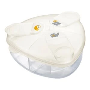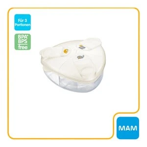 Der Milchpulver-Portionierer von MAM ist praktisch für unterwegs. In getrennten Kammern sind 3 Einzelportionen immer schnell griffbereit. Milchpulver-Portionierer von MAM 3 Kammern, einzeln zu öffnen jede Kammer für 40 Gramm Milchpulver aus robustem Kunststoff Die innovativen, dreieckigen Portions-Kammern entleeren sich rückstandsfrei in Babys Fläschchen. Der Portionierer bietet Platz für drei Portionen zu je 40 Gramm Milchpulver. Für unterwegs ist der Milchpulver-Portionierer durch seine flache Form in jeder Babytasche unterzubringen. Für eine einfache Befüllung und Reinigung lässt sich der Verschlussdeckel einfach komplett abnehmen. Die einzelnen Kammern sind abgetrennt voneinander und haben jeweils eine Schütte. So kommt nichts durcheinander und immer die korrekte Menge in das Fläschchen. Pflegeleicht: Die Milchpulverbox ist sterilisierbar und darf in die Spülmaschine.