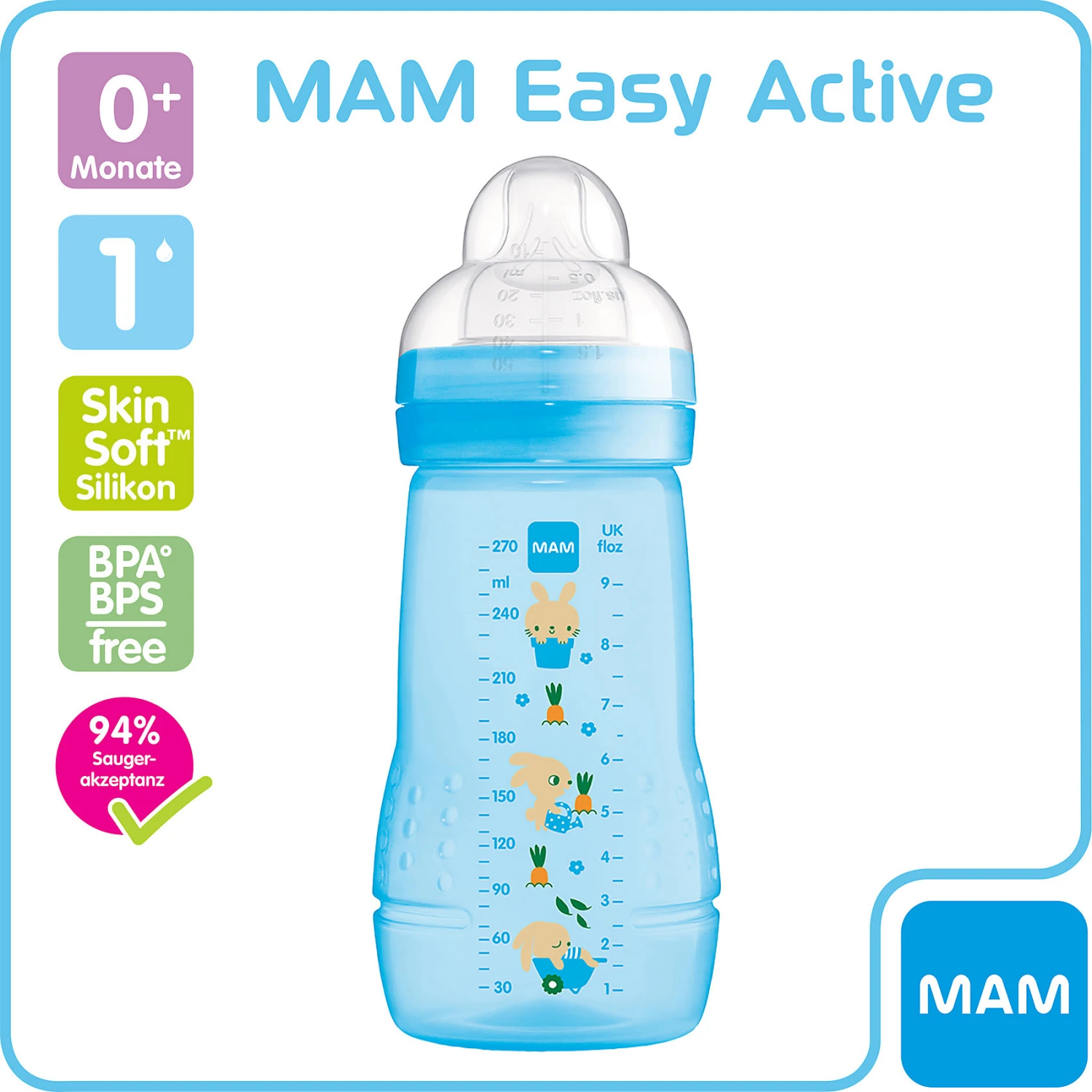 Die MAM Easy Active Weithalsflasche im Lieblingsdesign ist mit einem flexiblen Sauger aus besonders weichem Silikon ausgestattet, was es dem Baby erleichtert, das Fläschchen zu akzeptieren. Die Easy Active Flasche eignet sich daher auch ideal für den Übergang vom Stillen zur Flasche.