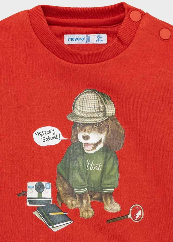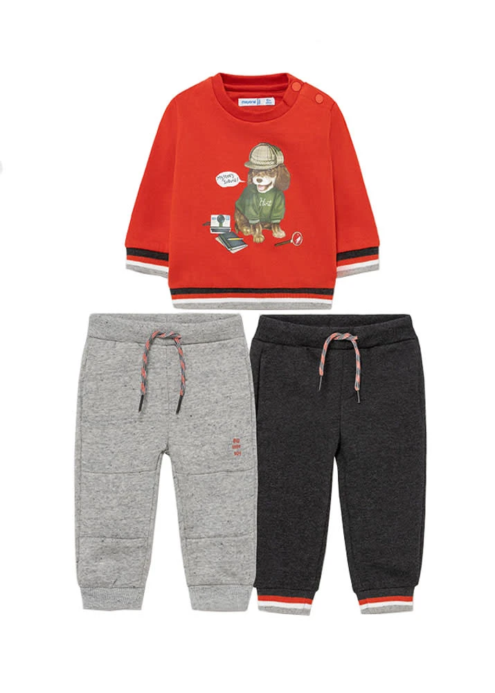Mayoral Baby Jogginganzug Dieses 3-teilige Mayoral Set für Babys und Kleinkinder besteht aus einem Sweatshirt und zwei langen Jogginghosen in verschiedenen Farben. Die Kombination ist innen mit weichem Sweatmaterial angeraut. Das Sweatshirt hat einen Rundhalsausschnitt und eine Knopfleiste an der linken Schulter. Ärmel und Bund schließen mit Rippstrick ab. Die Jogginghosen haben einen elastischen Bund mit Kordelzug und vordere Einschubtaschen. Die Knie der Kleinen werden beim Krabbeln durch das extra verstärkte Material an der Kniepartie geschont. Das Set für kleine Jungen ist mit dem frechen Detektivmotiv auf der Brust ein echter Hingucker.