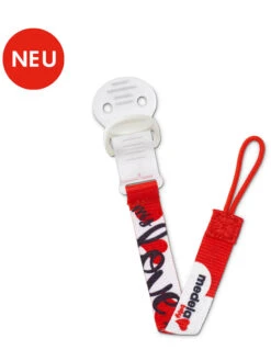 Achtung! Kontrolliert den Schnullerhalter vor jedem Gebrauch. Werft ihn beim ersten Anzeichen von Beschädigungen oder Mängeln sofort weg! Verlängert niemals den Schnullerhalter! Befestigt den Schnullerhalter niemals an Schnüren, Bändern, Trägern oder losen Teilen der Kleidung. Euer Kind kann sich damit erdrosseln.