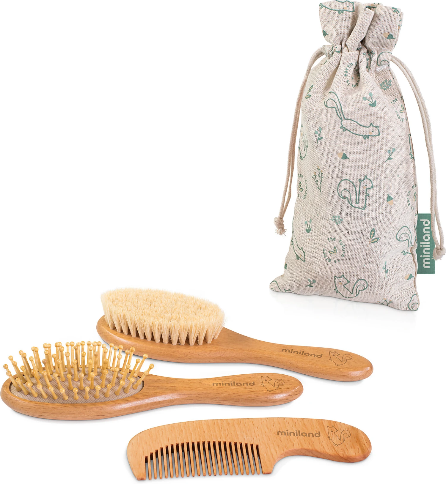 Das Bürsten- und Kammset von Miniland besteht aus Holz. Es eignet sich für eine schonende Pflege des Babys ohne Ziehen. Bürste und Kamm sind antistatisch und brechen die Haare nicht. Die extra weiche Naturborstenbürste wurde speziell für Neugeborene entwickelt, da sie nicht nur kämmt, sondern auch die Kopfhaut streichelt und ein angenehmes Gefühl vermittelt.