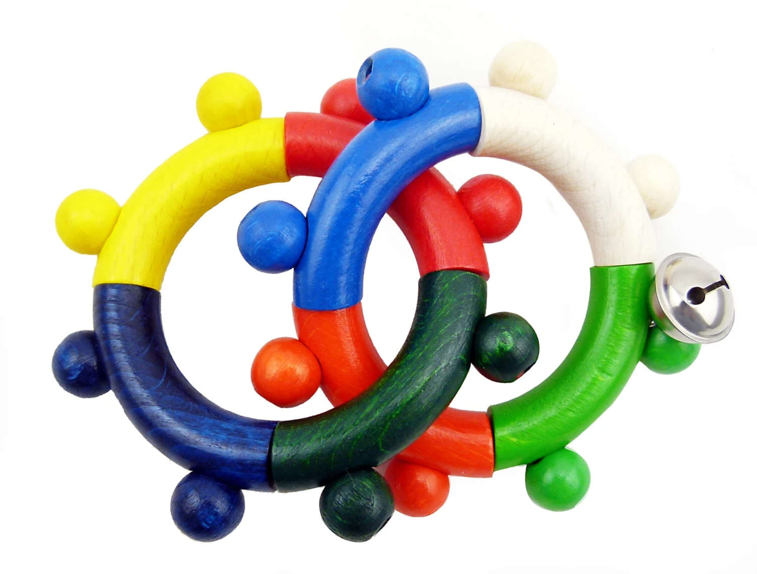 farbenfrohe und kindgerechte Rassel mit Holzelementen