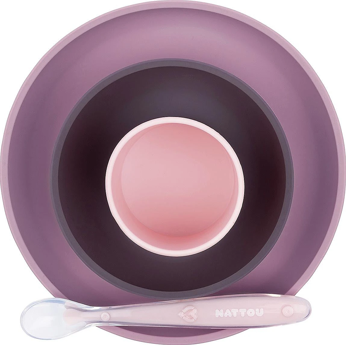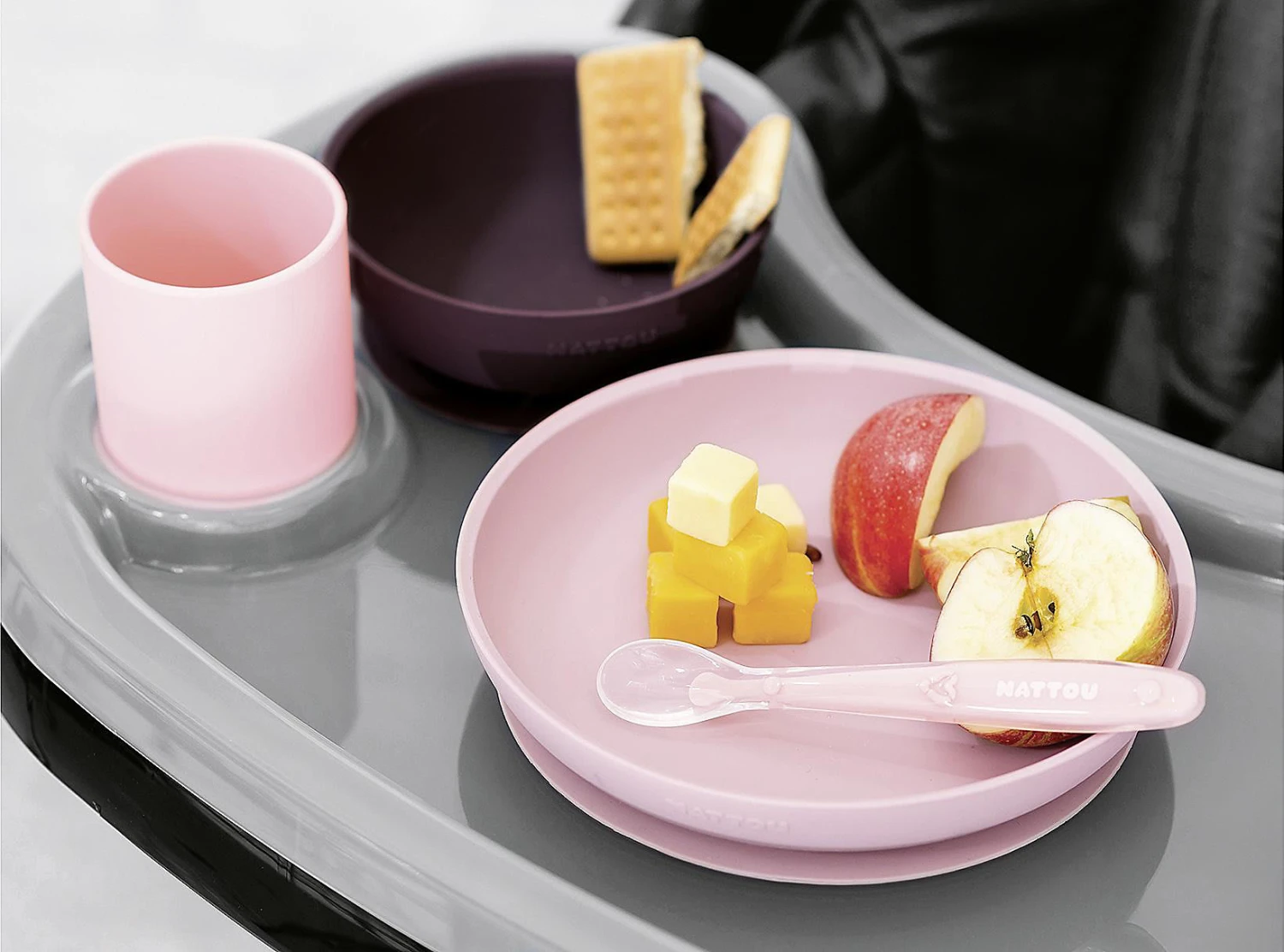 Dieses SIL Esslern Set aus dem Hause Nattou besteht aus vier Teilen und eignet sich ideal für selbstständige Esslernversuche. Mit dabei sind ein Löffel, ein Teller, eine Schüssel und ein Becher (ohne Henkel). Der Teller verfügt über einen erhöhten Rand, damit nicht so viel daneben geht. Dank der Saugnäpfe und des rutschfesten Materials hält das Geschirr gut auf dem Tisch.