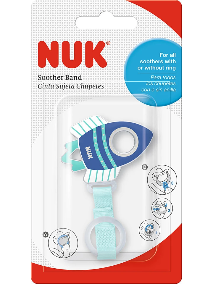Achtung! Kontrolliert den Schnullerhalter vor jedem Gebrauch. Werft ihn beim ersten Anzeichen von Beschädigungen oder Mängeln sofort weg! Verlängert niemals den Schnullerhalter! Befestigt den Schnullerhalter niemals an Schnüren, Bändern, Trägern oder losen Teilen der Kleidung. Euer Kind kann sich damit erdrosseln.