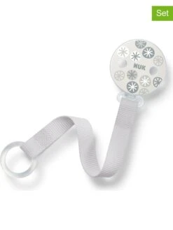 Achtung! Kontrolliert den Schnullerhalter vor jedem Gebrauch. Werft ihn beim ersten Anzeichen von Beschädigungen oder Mängeln sofort weg! Verlängert niemals den Schnullerhalter! Befestigt den Schnullerhalter niemals an Schnüren, Bändern, Trägern oder losen Teilen der Kleidung. Euer Kind kann sich damit erdrosseln.