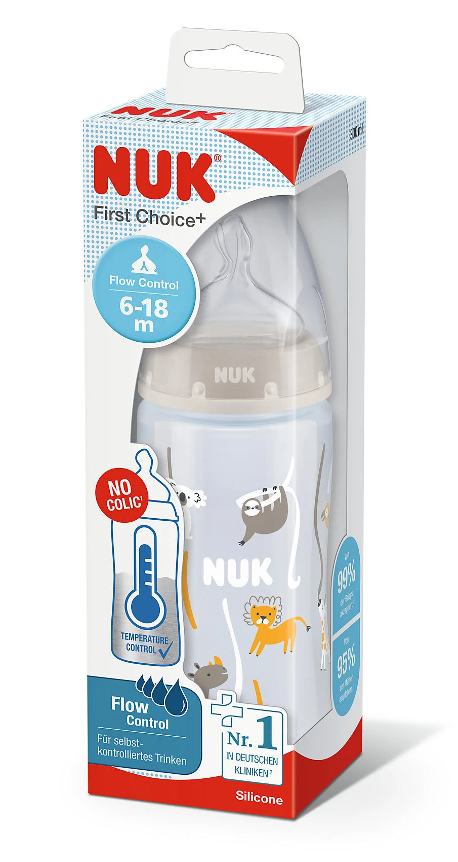 Die NUK First Choice Plus-Babyflasche unterstützt das eigenständige Trinken und ermöglicht es den Kleinen den Trinkfluss selbst zu kontrollieren. Die innovative Y-Öffnung sorgt dafür, dass die Öffnung sich, je nach Saugstärke des Babys öffnet und ist auslaufsicher gestaltet. Das NUK Anti-Colic Air System unterstützt den natürlichen Trinkfluss und verhindert, dass zu viel Luft geschluckt wird – so bleibt auch der Baby-Bauch friedlich. Die Temperature Control erleichtert den Eltern die Temperaturkontrolle – die Skala auf der Flasche verändert die Farbe. Ist der Inhalt zu heiß, wird die blaue Anzeige weiß. Auf einen Tropfen auf das Handgelenk zur Prüfung sollten die Eltern trotzdem nicht verzichten. Vor der Erstbenutzung sollte das Set in Einzelteile zerlegt werden und diese für 5 Minuten im kochenden Wasser sterilisiert werden. Dies dient der Hygiene