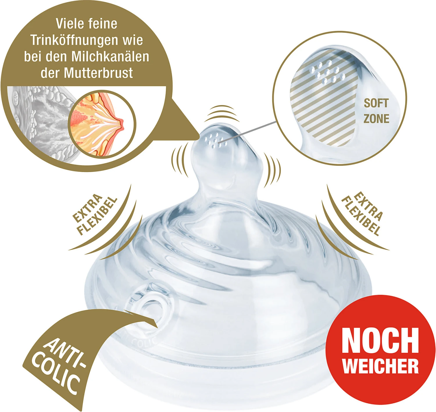 – den Milchkanälen der Mutterbrust nachempfunden: viele feine Trinköffnungen