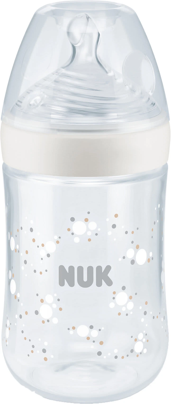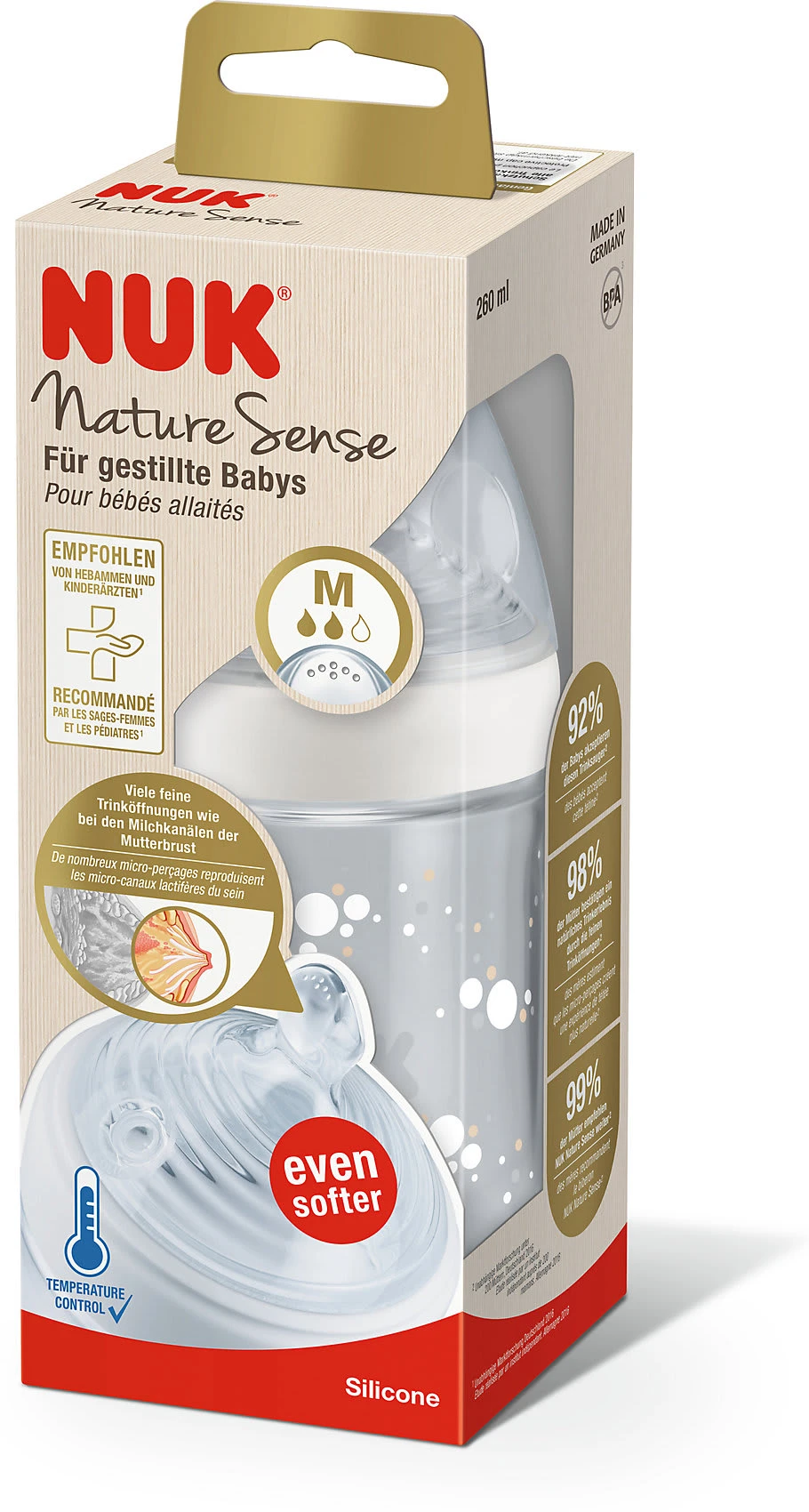 Mit der tollen „Nature Sense“-Babyflasche von NUK füttern Sie Ihren kleinen Liebling garantiert nie mit zu heißer Nahrung! Dank der „Temperature Control“-Anzeige sehen sie sofort, welche Temperatur der Inhalt des Fläschchens hat. Die vielen kleinen Trinköffnungen des Fläschens sind den Milchkanälen der Mutterbrust nachempfunden und ermöglichen gemeinsam mit der weichen und breiten Lippenauflage einen optimalen Trinkfluss.
