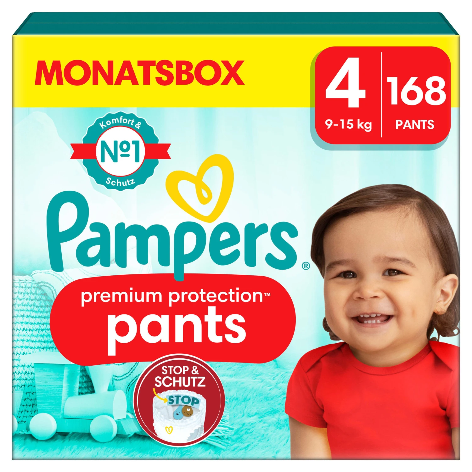 Komfort und Schutz von Pampers mit den Pampers Premium Protection Pants. Mit einem revolutionären Stop & Schutz Täschchen, das hilft, Auslaufen am Rücken zu verhindern – für bis zu 12 Stunden Rundum-Auslaufschutz. Wenn dein Baby aktiver wird und sich beim Windelwechseln dreht, brauchst du eine Windel, die bequem sitzt, zuverlässigen Schutz bietet und jede Bewegung mitmacht. Deshalb bieten Pampers Premium Protection Pants unseren weichsten Komfort und Schutz mit 360° Komfort-Fit dank der ultra weichen und dehnbaren Materialien, die sich den Bewegungen deines aktiven Babys anpassen. Die Pampers Premium Protection Pants sind wie alle Pampers Pants leicht zu wechseln: Sie lassen sich mit nur einem Zug anziehen, durch leichtes Aufreißen an den Seiten ausziehen, einrollen und für ein einfaches Entsorgen mit dem Klebestreifen verschließen – selbst dann, wenn das Baby sich hin und her bewegt. Genau wie für dich, steht die Sicherheit deines Babys für uns an erster Stelle: Pampers Premium Protection Pants sind dermatologisch getestet und enthalten 0% EU-Parfümallergene (gemäß EU-Kosmetikverordnung Nr. 1223/2009). Sie wurden von Dermatologen der Skin Health Alliance bestätigt und gemäß Standard 100 von Oekotex getestet und zertifiziert.