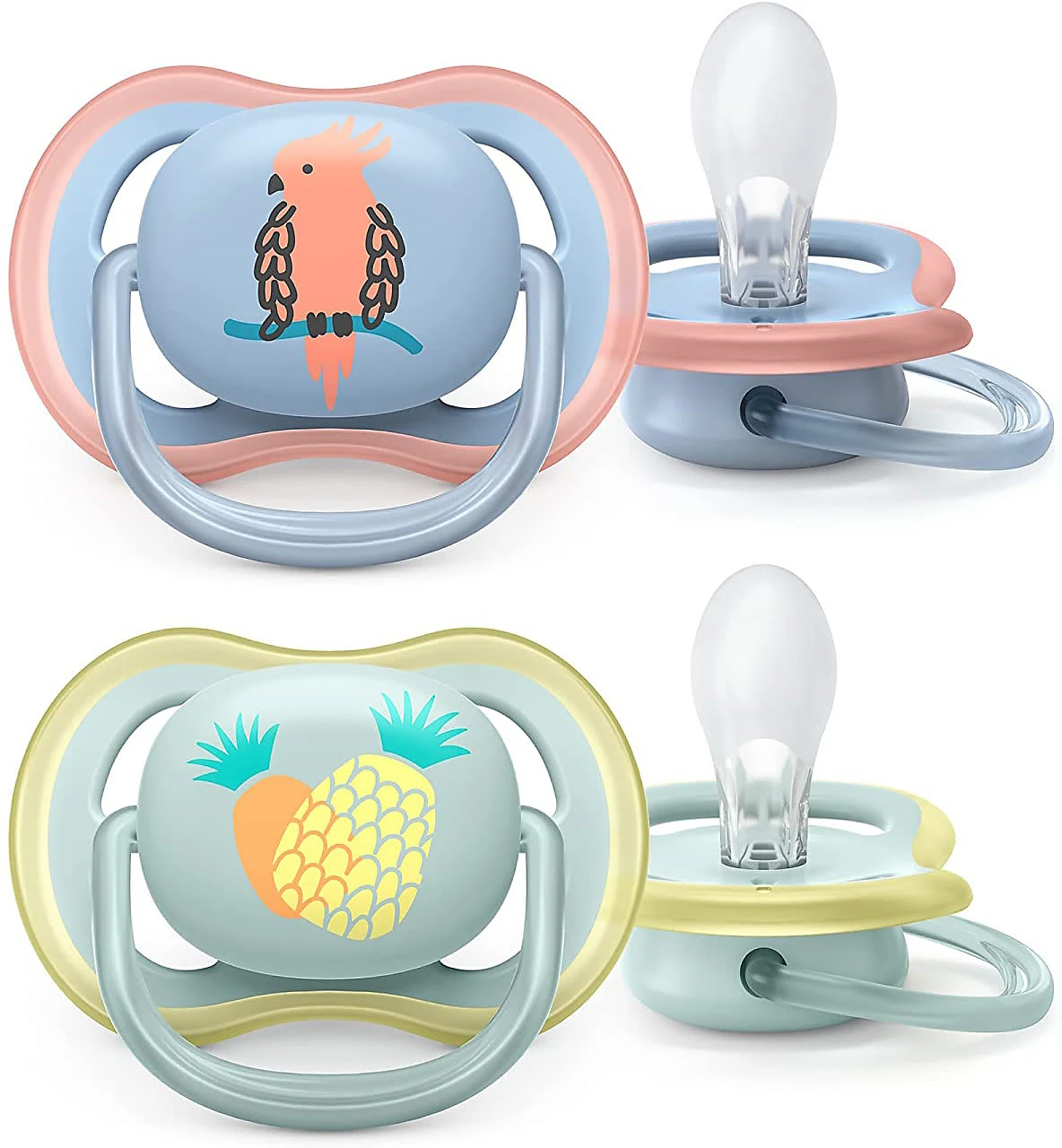 Die Philips Avent Ultra Air Schnuller begeistern nicht nur mit ihrem Design. Das leichte Saugschild verfügt über große Öffnungen, so dass möglichst viel Luft an den Mundbereich gelangt und dieser nicht austrocknet. Der weiche Silikonsauger wird von Babys leicht angenommen und unterstützt die natürliche Entwicklung des Kiefers.