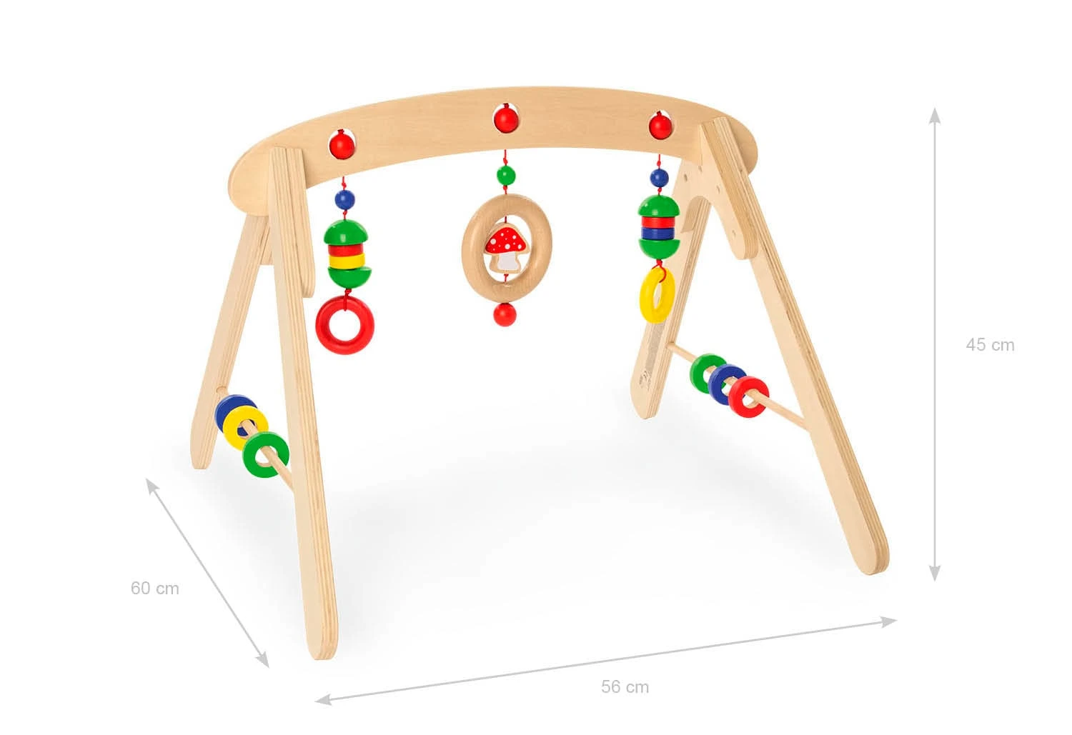 Babygym ‚Jane‘, mit diversen Kugeln, Ringen, Halbkugeln, einem Glückspilz, seitlich und von oben hängend zur Spiel- und Greifanimation aus massivem Ahorn, klar und bunt lackiert, Maße B 56 cm x T 60 cm x H 45 cm, Teilmontage erforderlich. Das farbenfrohe und pädagogisch wertvolle Babygym ist eines der ersten und bewusst erlebten Spielzeuge deines Kindes. Die seitlich und von oben hängenden Kugeln, Ringe, Halbkugeln und der Glückspilz animieren Säuglinge zum Spielen und Greifen. Der Spielbogen schult spielerisch die Hand-/Augen-Koordination, fördert die Wahrnehmungsfähigkeit und trainiert gleichzeitig die Geschicklichkeit deines Kindes. Das Holzspielzeug ist für Babys ab 3 Monaten geeignet. Die hochwertige Verarbeitung garantiert Sicherheit und das schöne Design macht das Babygym aus Holz zu einem echten Hingucker in jedem Raum. So wird ‚Jane‘ zu einem tollen Geschenk zur Geburt oder zur Taufe .Pinolino erfüllt seit 1997 Kinderträume und vertreibt Kindermöbel, Accessoires und Spielwaren. Das deutsche Unternehmen verwendet nur für Kinder geeignete Lacke, Lasuren und Öle und bietet viele FSC®-zertifizierte Produkte an.