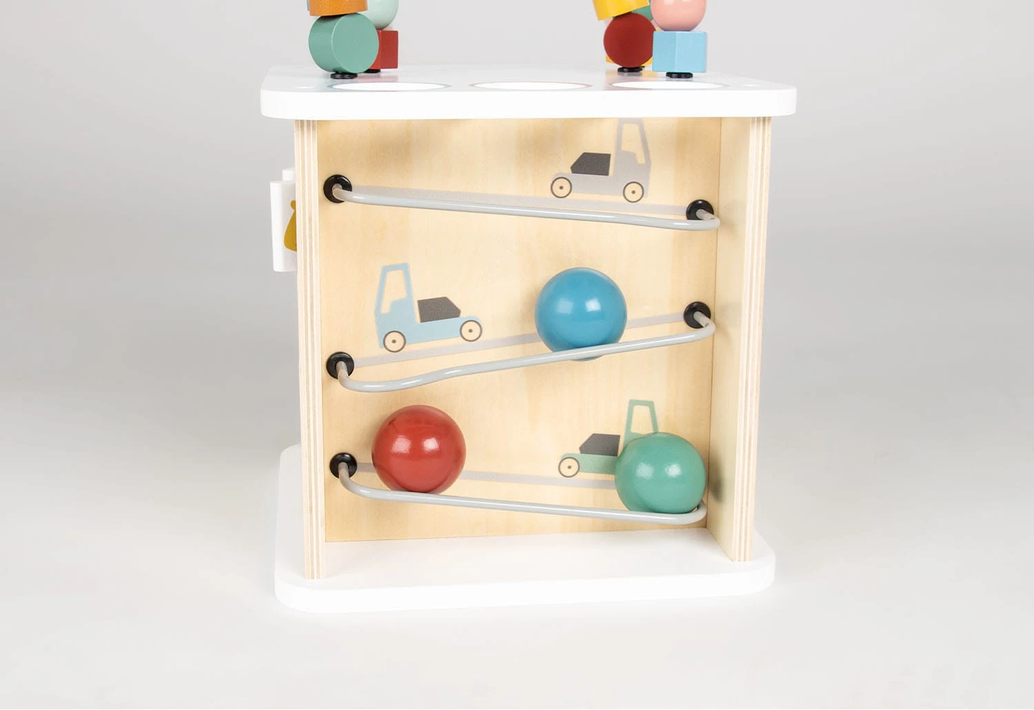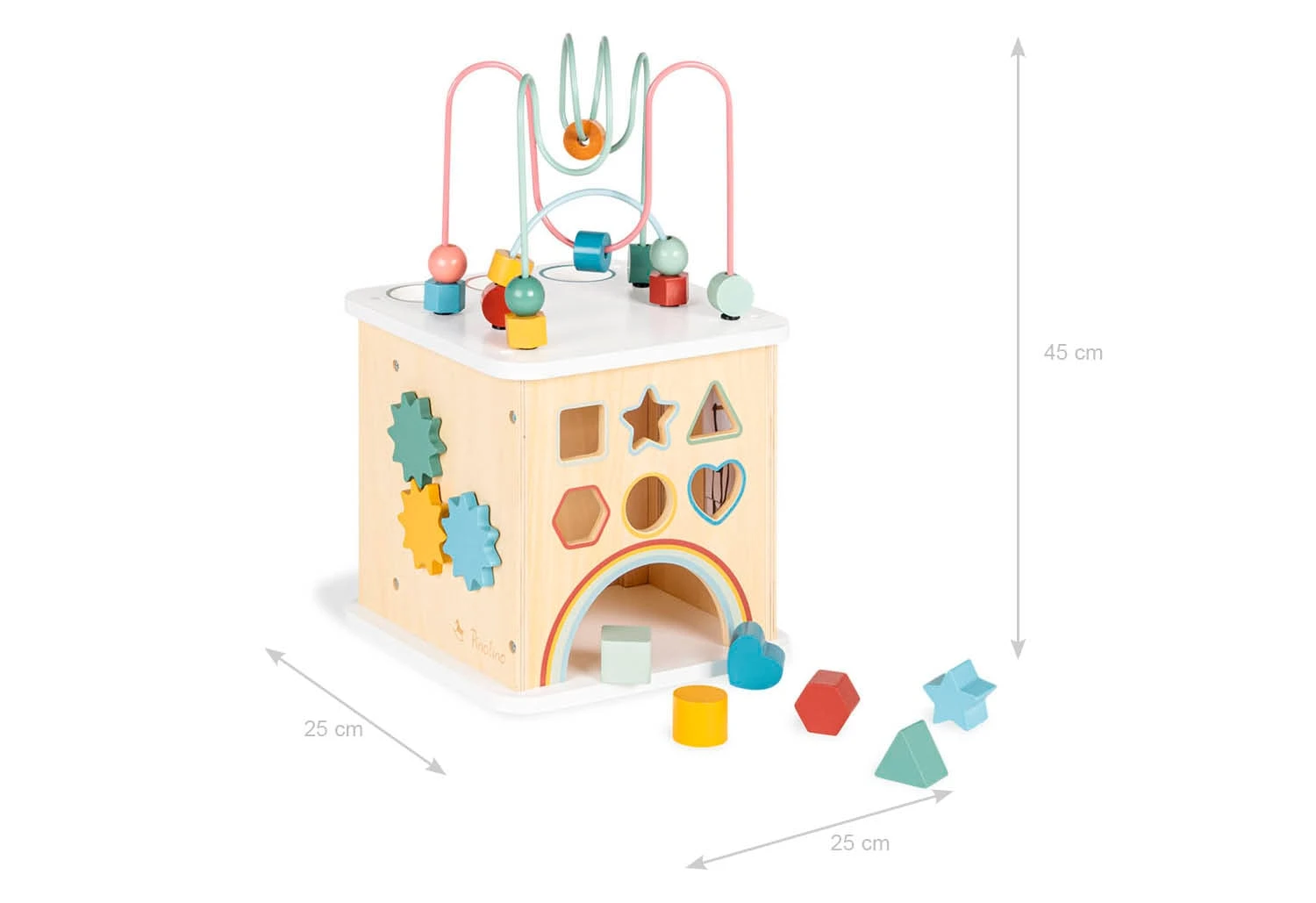 Pinolino Motorikwürfel ‚Sanna‘ 10 teilig mit bunten Kugeln, Bauklötzen und Motorikschleife auf dem Würfel. Teilmassiv und Metal: Linde und MDF, klar und bunt lackiert, Maße B 25 cm x T 25 cm x H 45 cm, FSC®-zertifiziert (FSC-C120795). Durch die Motorikschleife wird die Motorik spielend gefördert. Im Innenraum befindet sich eine Kugelbahn mit großen Kugeln, die zusätzlichen Spielspaß liefert. Der Activity Würfel wird für Kinder ab 1 ½ Jahren empfohlen. Das Spielen mit dem FSC®-zertifizierten (FSC-C120795) Motorikwürfel und den in der Lieferung enthaltenen Bauklötzen macht nicht nur Spaß, sondern fördert gleichzeitig die Hand-Augen-Koordination und somit die Denkleistung der Mädchen und Jungen. Die hochwertige Verarbeitung und die bunte Lackierung sorgen für einen langen Spielspaß und ein ansprechendes Design. ‚Sanna‘ ist eine tolle Geschenkidee für Kleinkinder zum Geburtstag oder zu Weihnachten .Pinolino erfüllt seit 1997 Kinderträume und vertreibt Kindermöbel, Accessoires und Spielwaren. Das deutsche Unternehmen verwendet nur für Kinder geeignete Lacke, Lasuren und Öle und bietet viele FSC®-zertifizierte Produkte an.