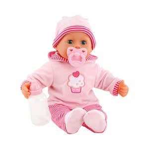 First Words Baby von Bayer Design ist eine Weichkörperpuppe mit 24 Funktionen und Schlafaugen. Drückt man auf ihr Bäuchlein, lacht sie, weint sie, sagt Mama oder Papa und macht verschiedene Baby-Laute. Weichkörper-Puppe mit 24 Funktionen und Schlafaugen, 38 cm zusätzlich sind noch ein Schnuller und ein Fläschchen enthalten Lieferung erfolgt in hübscher Geschenkverpackung Batterien 3x LR44 Knopfzellen enthalten First Words Baby trägt einen kuschelweichen Kapuzenpullover mit passender Hose und Mützchen.