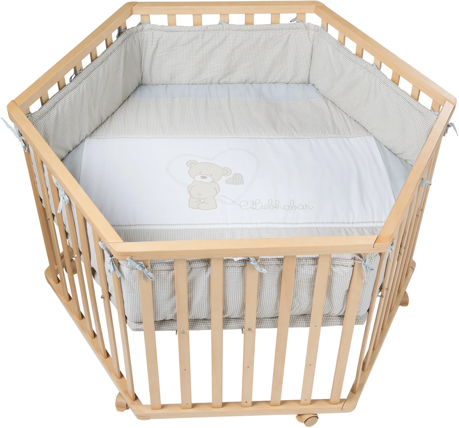 .Das 6-eckige Laufgitter „Liebhabär“ von Roba bietet Ihrem Liebling eine sichere Spielwiese. Das Laufgitter kommt komplett ausgestattet mit einer waschbaren und weich gepolsterten Einlage und einem Bremsrollensatz.