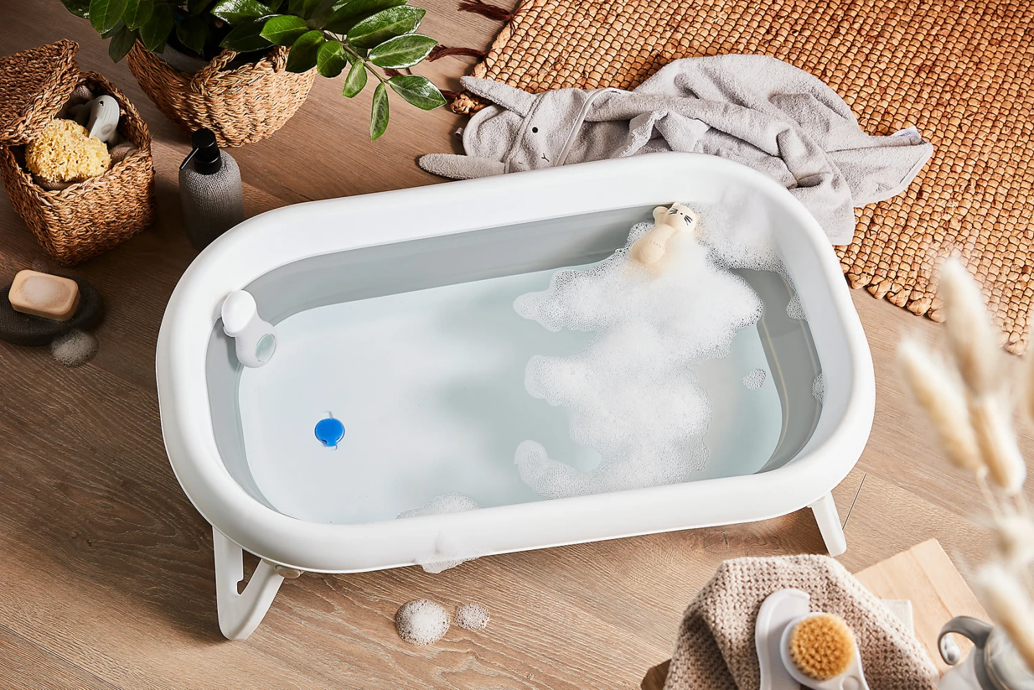 Die faltbare Baby Bath 2go Badewanne der Marke Rotho Babydesign eignet sich ebenso gut für die Anwendung Zuhause wie unterwegs. Zum Transportieren kann die Wanne ganz einfach zusammengeklappt und ebenso leicht wieder aufgestellt werden. Der wärmeempfindliche Ablaufstopfen wechselt je nach Wassertemperatur seine Farbe und liefert so eine ungefähre Temperaturanzeige.