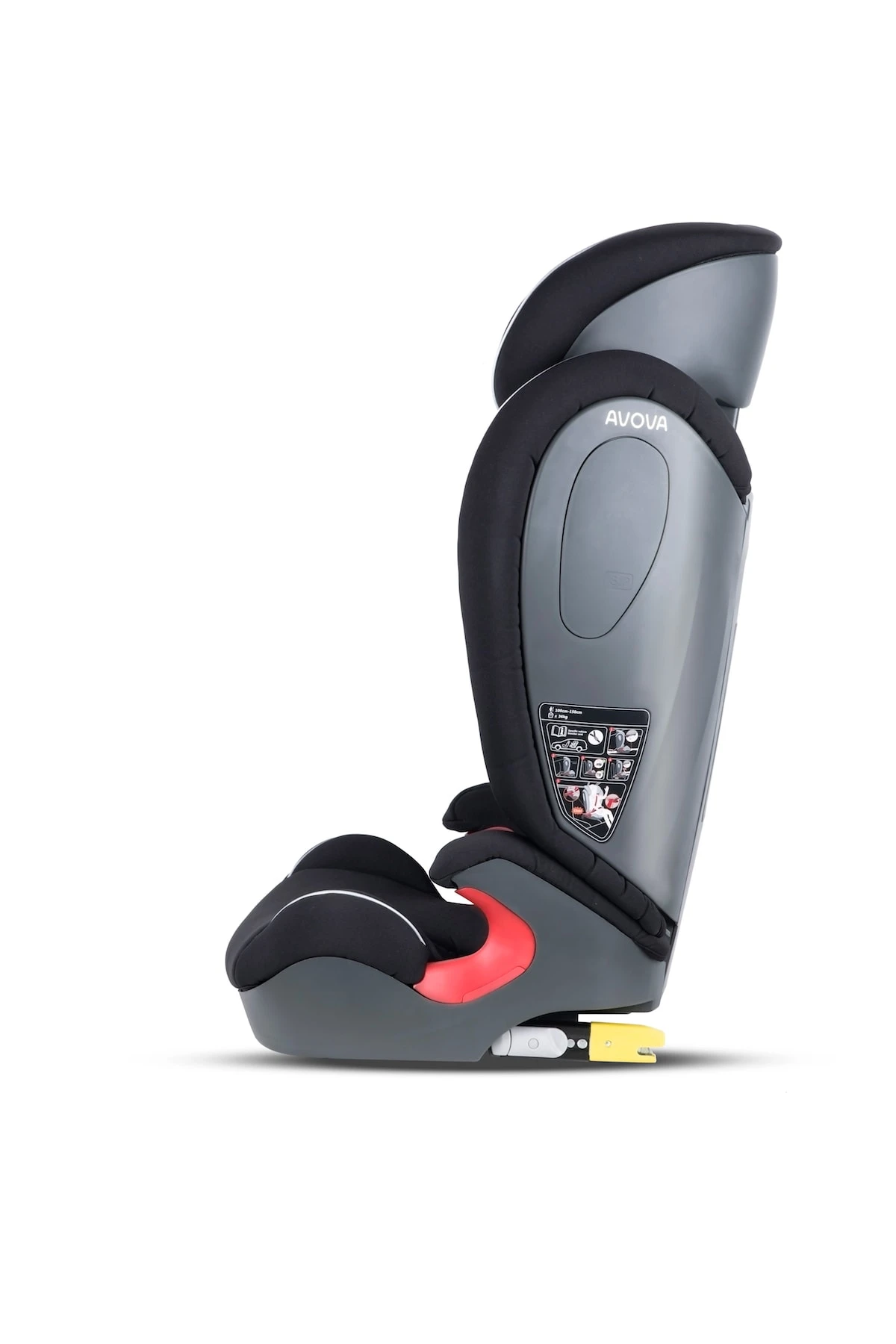 Höchste Sicherheit Statt an Breite darauf zupacken, packt AVOVA smarte Sicherheitstechnik in den Sitz. Das spart Raum und macht Platz für einen verbesserten Seitenaufprallschutz. Auch die tiefen und weich gepolsterten Seitenwangen erhöhen den Seitenaufprallschutz. Die verlängerte Führung des Beckengurtes sorgt dafür, dass der Beckengurt beim Kind richtig sitzt und somit das Verletzungsrisiko im Falle eines Unfalls reduziert wird. Durch die feststellbare Schultergurtführung bleibt auch der Gurt immer am richtigen Platz.