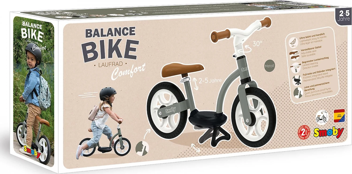 Das Laufrad „Komfort“ stammt aus dem Hause Smoby und ist ideal geeignet, um sich auf das Fahrradfahren vorzubereiten. Es fördert neben der Balance auch die Motorik und Koordination. Eine individuelle Anpassung ermöglicht der höhenverstellbare Sitz, während die gepolsterten Griffe am Lenker ein Wegrutschen der Hände verhindern. Dank des zentralen Trittbretts und des tiefen Einstiegs sind das Auf- und Absteigen ganz einfach. Zudem bieten die flüsterleisen Räder eine möglichst geräuscharme Fortbewegung. Ein besonderer Pluspunkt ist der Ständer, mit dem das Laufrad praktisch abgestellt werden kann.