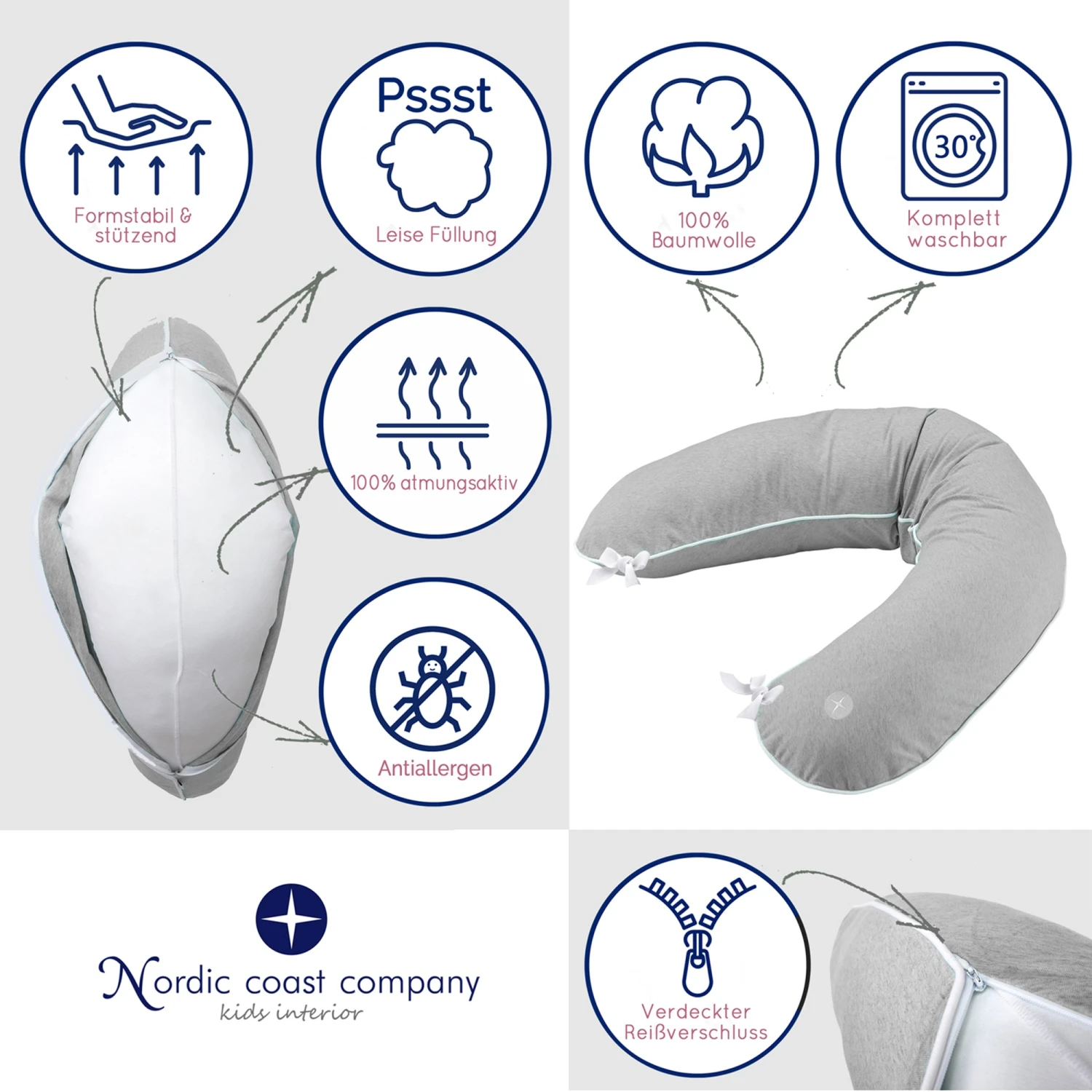 BESTE QUALITÄT: Das Stillkissen besteht aus bester Qualität: Der Bezug besteht aus 100% weicher, OEKO TEX zertifizierter Baumwolle, piddelt nicht und verliert auch nach häufigem Waschen weder Form noch Farbe. Das Kissen ist zudem antiallergen und atmungsaktiv sowie bei 30 Grad komplett waschbar. Der Bezug kann mit dem extra langem, verdecktem Reißverschluss abgenommen werden.