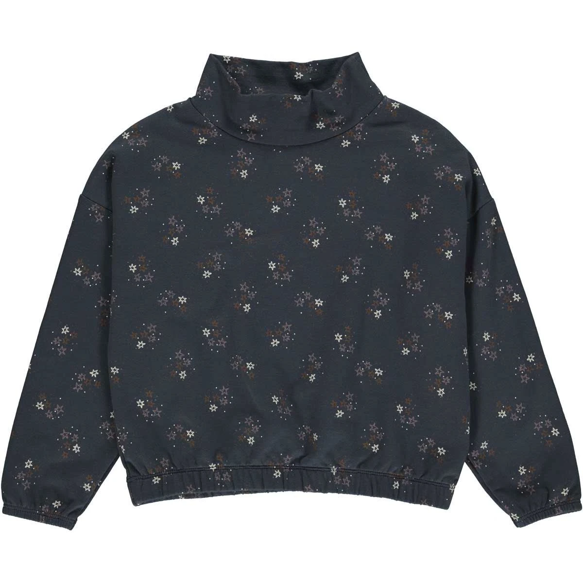 Der Sweatpullover ist aus weicher Bio-Baumwolle hergestellt. Es verfügt über einen zarten Sternen Alloverprint. Das Shirt hat einen kleinen Stehkragen und einen etwas kürzeren Schnitt. Das Produkt ist durch Ecocert Greenlife Lic. No. 152033 GOTS Organic zertifiziert. Dies ist aktuell der höchste Standard für Bekleidung. Alle Produktionsprozesse wie Färben, Weben und Nähen werden unter strengsten Vorgaben mit Rücksicht auf die Umwelt durchgeführt. Auch die Arbeitsbedingungen werden während der einzelnen Produktionsschritte streng überwacht. Baumwolle 95%, Elasthan 5%