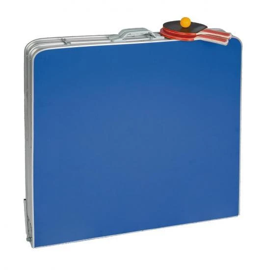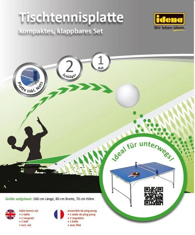 Mit diesem Tischtennis-Set kommen große und kleine Tischtennisfans voll auf ihre Kosten! Die Tischtennisplatte ist in sekundenschnelle aufgebaut und kinderleicht wieder zusammengeklappt. Dank einer Packgröße von ca. 82,5 x 82,5 x 11 cm, eines Tragegriffs und eines Gewichts von lediglich 1,2 kg lässt sie sich problemlos verstauen und überall mit hinnehmen. Im Set enthalten sind die Tischtennisplatte, ein Tischtennisnetz, zwei Tischtennisschläger und ein Ball. Größe aufgebaut: 160cm Länge, 80cm Breite, 70cm Höhe