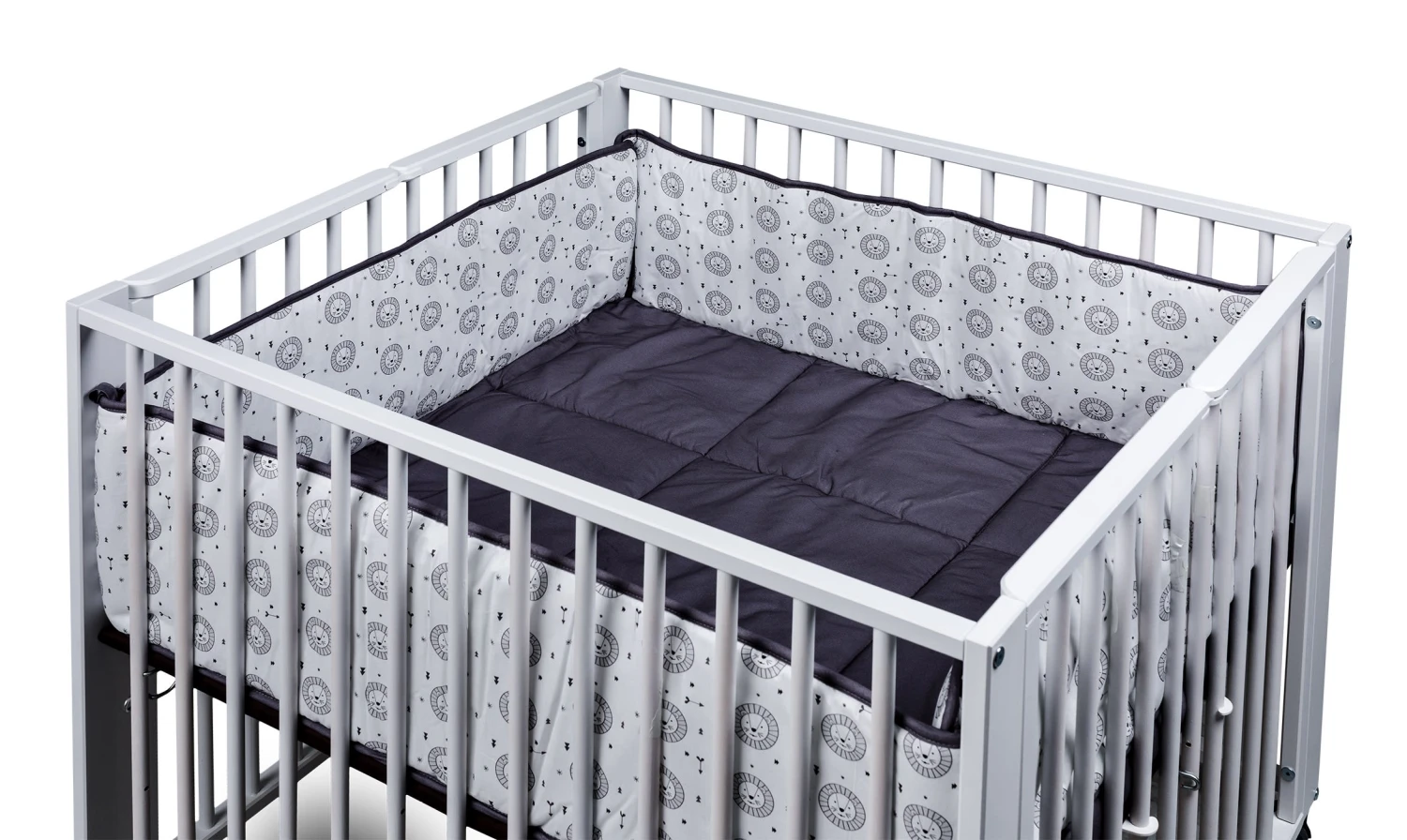 Die kuschelige Einlage aus natürlicher Baumwolle ist mit Polyester gefüllt und wird mit kleinen Bindebändchen an den Gitterstäben befestigt.