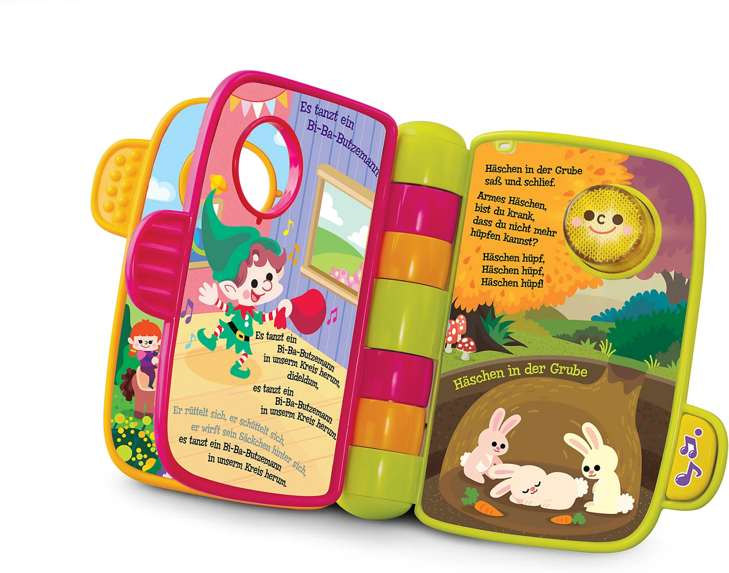 In dem farbenfrohen Baby-Liederbuch aus dem Hause Vtech gibt es vier verschiedene Lieder, zahlreiche Melodien, Liedtexte und schöne Illustrationen zu entdecken! Die vier Seiten sind liebevoll gestaltet und mit Tasten ausgestattet, die jeweils eines der bekannten Lieder aktivieren. So können Kinder sich zu der Musik bewegen, mitsingen und jede Menge Spaß haben.
