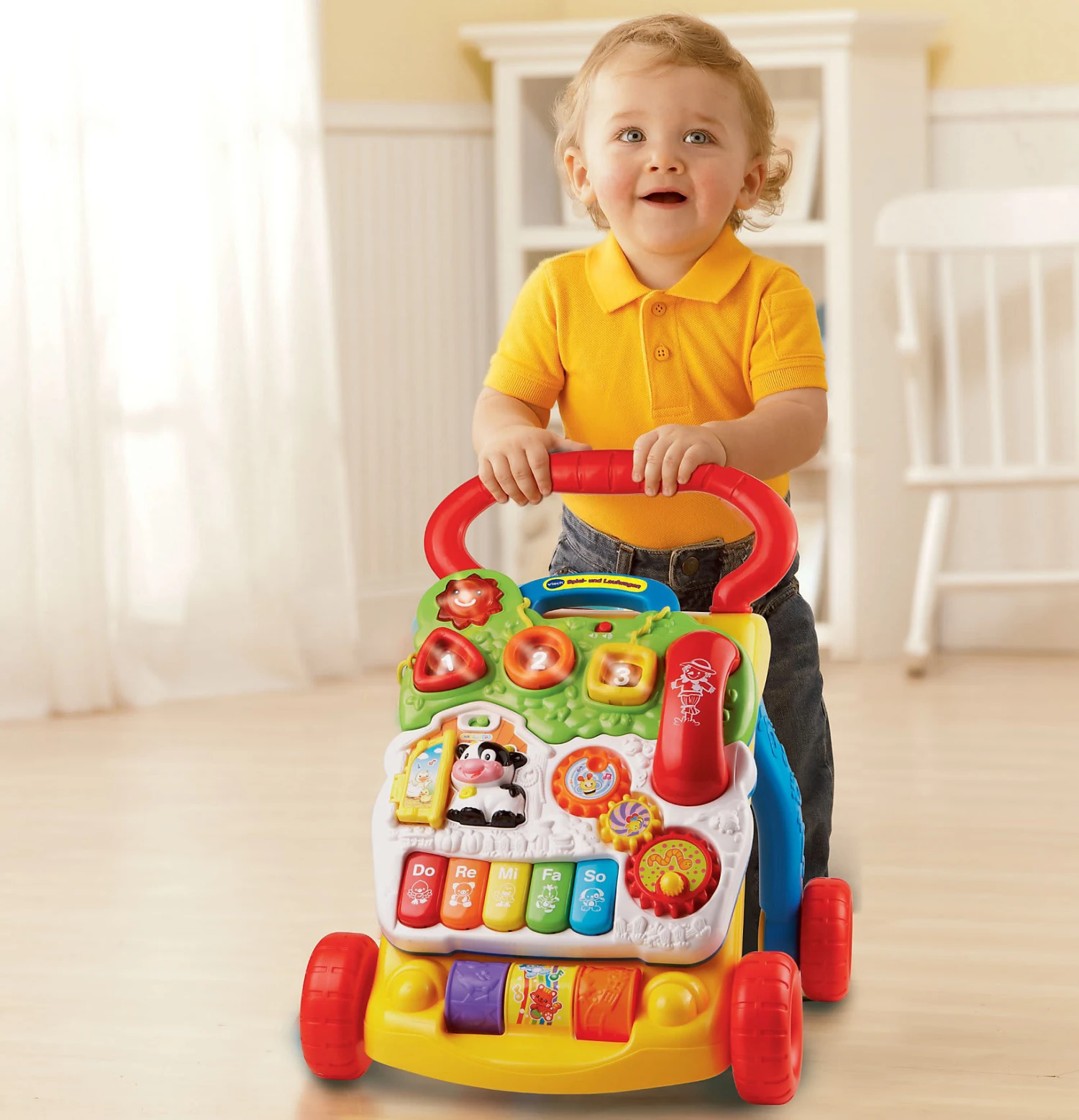 Aber auch bevor Ihr Kind die ersten Gehversuche unternimmt, kann es mit dem abnehmbaren Spielboard seine motorischen Fähigkeiten trainieren. Die drei leuchtenden Formentasten und die vielen beweglichen